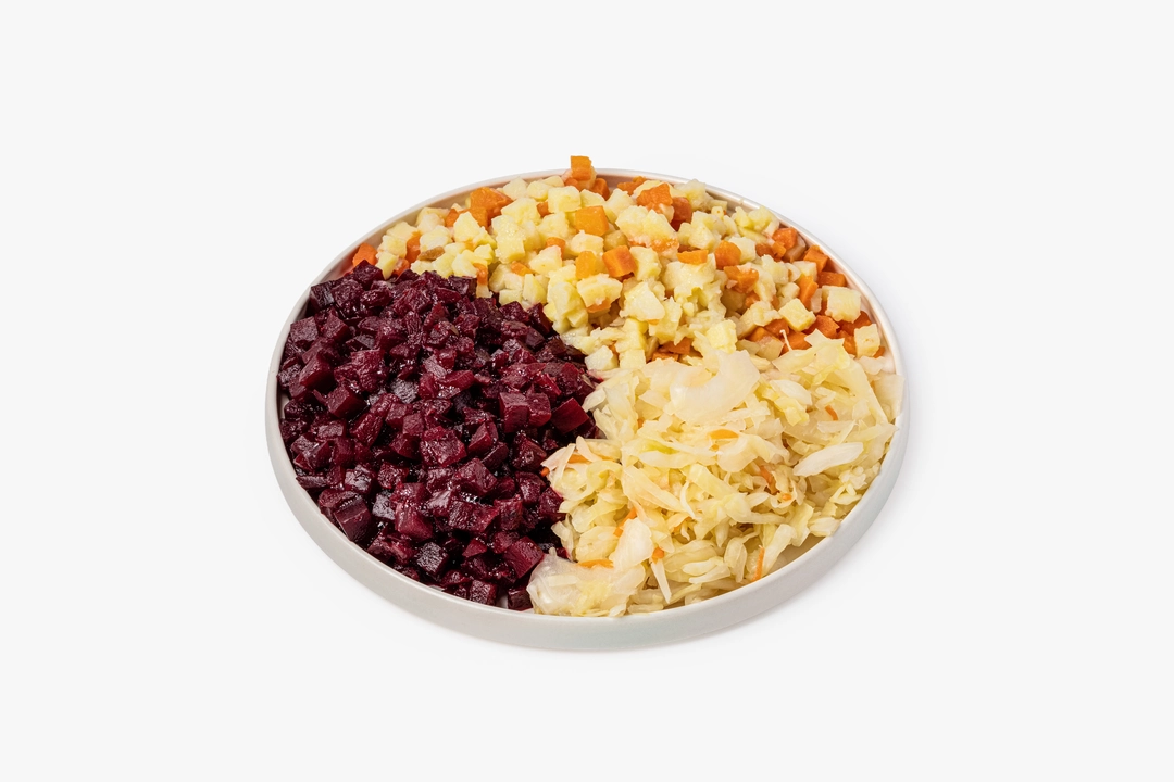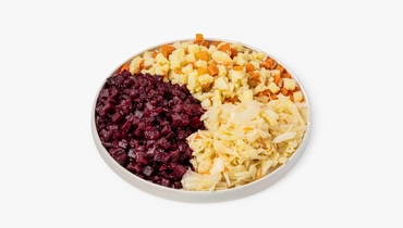Готовый набор для классического винегрета, с которым вы без труда приготовите популярное блюдо. Мы уже отварили овощи, нарезали их и добавили квашеную капусту, вам останется только смешать все ингредиенты, положить горошек, а потом заправить салат растительным маслом. Это большая порция, которой хватит для приготовления семейного ужина. В наборе: картофель — 130 г, свёкла — 300 г, морковь — 60 г, капуста квашеная — 160 г.