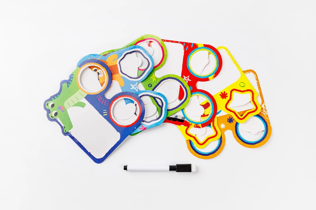 Эта весёлая игра помогает детям развивать логическое мышление, внимание и умение общаться. На картонных очках есть специальное поле, где пишут, кто загаданный герой. Участник не видит надпись на своих очках и должен угадать. А остальные подсказывают ему с помощью наводящих вопросов. Можно писать маркером и стирать, чтобы играть снова и снова. В комплекте 6 пар очков и маркер на спиртовой основе. Подходит для компании от 2 до 6 человек, а простые правила позволяют играть даже пятилетним.