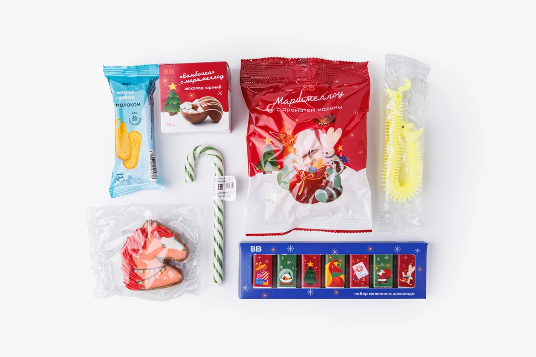 Этот праздничный набор объединяет сразу несколько сладких сюрпризов в новогодней тематике. Пряник в виде символа года с тёплыми нотами имбиря и корицы, разноцветные леденцы с фруктовыми вкусами яблока, клубники и черники, нежное молочное печенье и плитки молочного шоколада с ванильным ароматом. Дополняют комплект воздушный маршмеллоу с малиной и шоколадная бомбочка для приготовления уютного напитка с зефирками. Набор станет приятным подарком для детей и взрослых и поможет создать атмосферу волшебства и радости в новогодние дни.