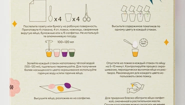 Набор пищевых сухих красителей — простой способ красиво и безопасно покрасить яйца к празднику. В комплекте 4 цвета: зелёный, оранжевый, розовый и фиолетовый. Один пакетик рассчитан минимум на 3 яйца. Чтобы получить яркие и насыщенные оттенки, просто разведите краситель тёплой водой и опустите яйцо на 5–10 минут. После окрашивания яйца можно смазать растительным маслом — для блеска.