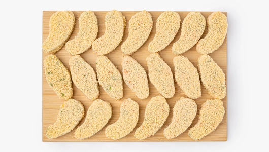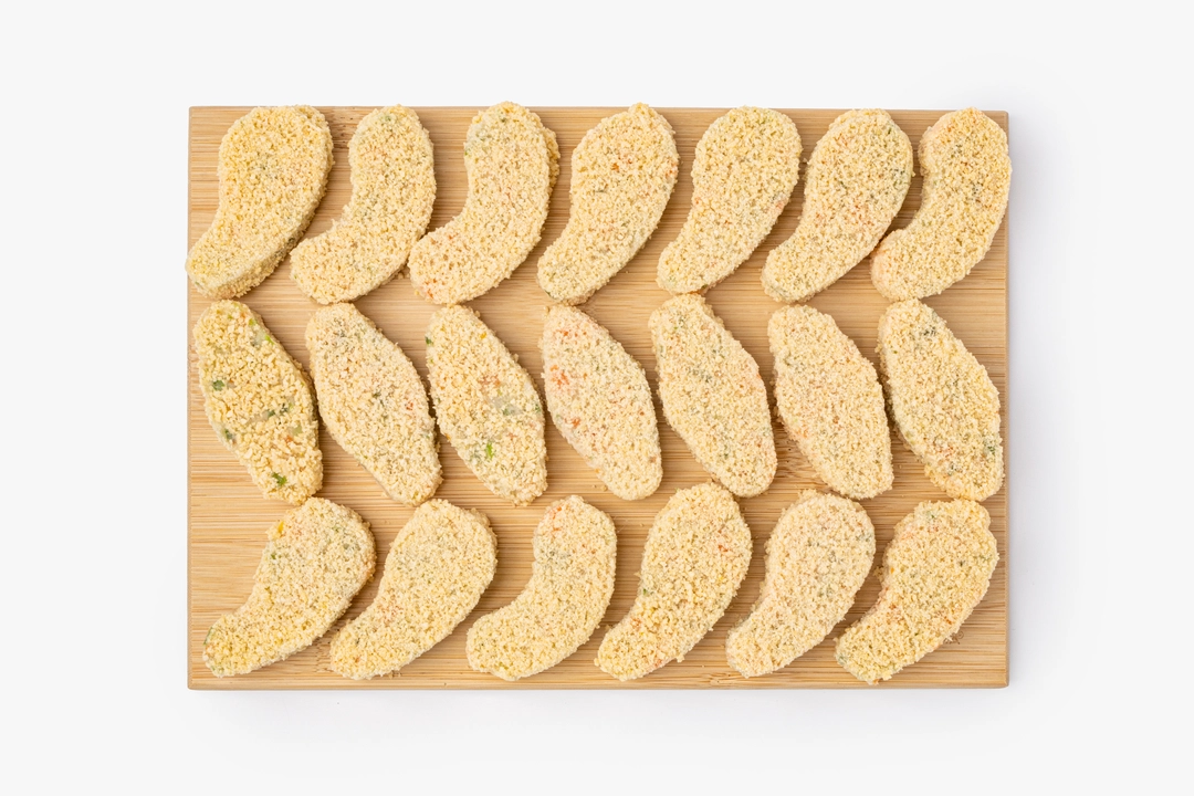 Замороженные наггетсы из белокочанной и цветной капусты, брокколи, стручковой фасоли, моркови, болгарского перца, кукурузы и зелёного горошка. Мы измельчили овощи, добавили кукурузную муку и обваляли кусочки в панировочных сухарях, поэтому они хорошо держат форму при обжарке. Куркума придаёт продукту насыщенный цвет, а специи — деликатную пряность. Приготовьте наггетсы любым удобным способом и подавайте с соусом по вкусу. Это лёгкий и сытный вариант для перекуса в дороге, на работе или под любимый фильм. Продаётся на развес.