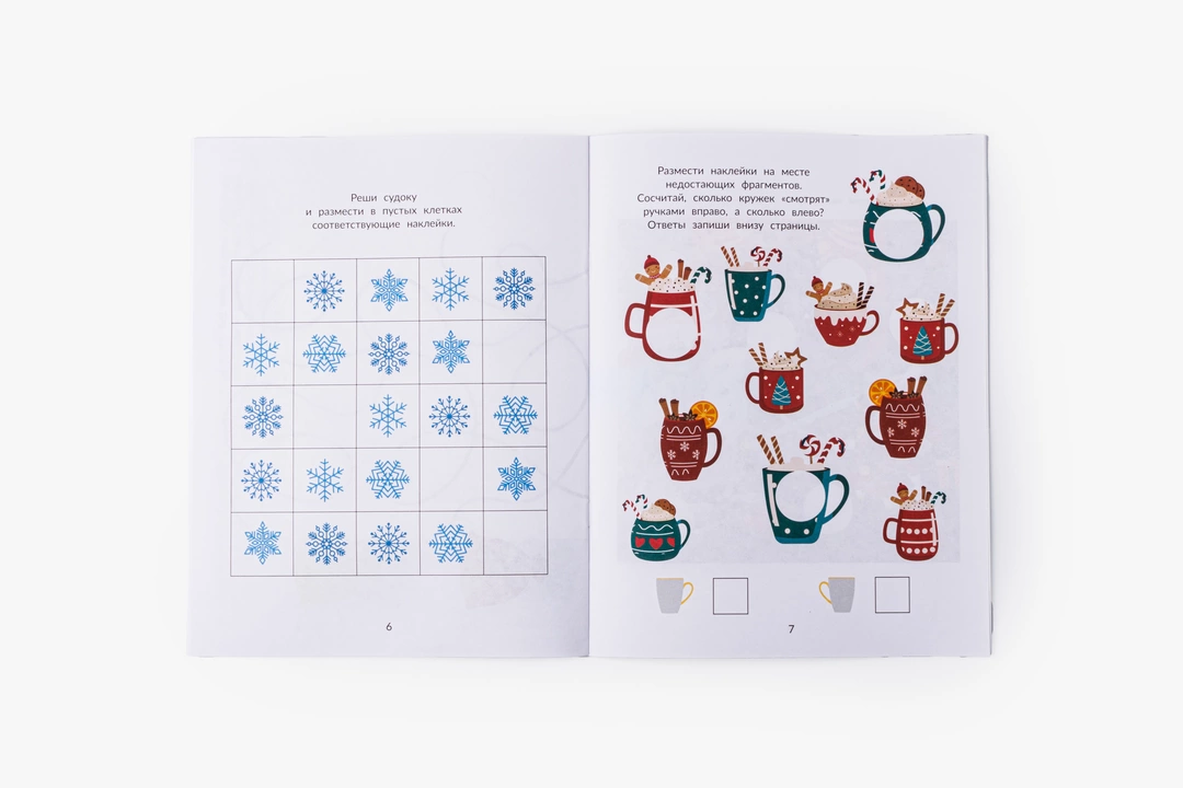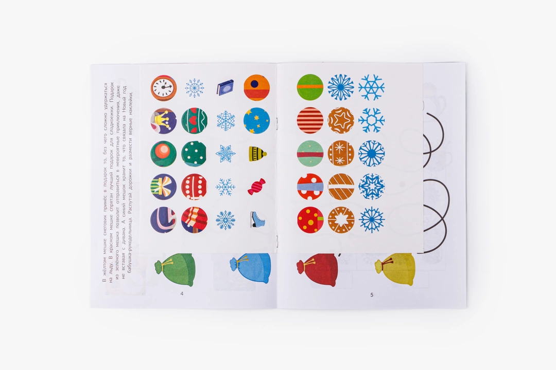 Книжка с заданиями и наклейками, где снежинки, сладости и подарки становятся частью весёлых логических задач. Ребёнку предстоит выполнять увлекательные упражнения на логику и внимание, используя яркие стикеры. Каждое задание построено так, что наклейки становятся его важной частью — это мотивирует малыша и делает обучение интересным. Процесс работы с мелкими элементами тренирует пальчиковую моторику и творческие способности. В книжке 8 страниц, а мягкая обложка делает её удобной для детских рук. Рекомендовано для детей от 5 лет.