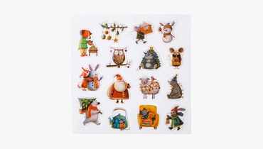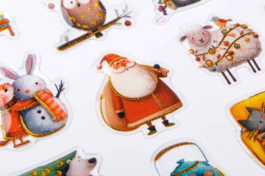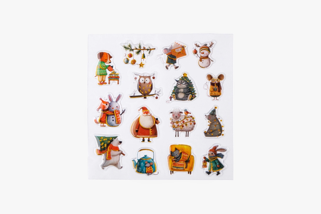 Небольшой набор с новогодними наклейками помогает создать тёплое зимнее настроение. Здесь есть зверята, ёлочные игрушки и забавные персонажи, нарисованные в уютной праздничной палитре. Поверхность наклеек украшена тонкими голографическими акцентами — они мягко поблёскивают и делают каждый элемент более выразительным. Их удобно наклеивать на открытки, подарочные пакеты, ежедневники или детские поделки. Наклейки плотные и хорошо держатся на поверхности — подойдут для небольшого сюрприза или для моментов новогоднего творчества с детьми.