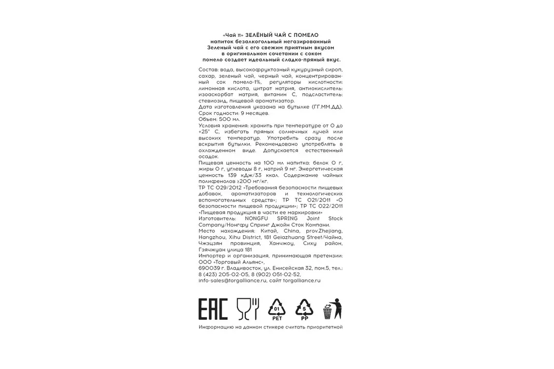 Холодный Чай Пи Зеленый чай с помело - это чай премиум класса. Содержит в своем составе классический зеленый чай и 100% сок помело, которые идеально сочетаются между собой. В основе напитка лежит высококачественная вода из природных источников Китая Чай смешивается с фруктами и имеет свежий и натуральный вкус. Бодрящий зеленый чай сок помело - это невероятное сочетание. Палитра натуральных ароматов: чайный, фруктовый аромат помело раскрывает вкус чая. Классический зеленый чай с помело обязательно порадует вас неповторимым вкусом. Чай π - это чай № 1 по продажам в Китае в категории фруктовый чай. Название Чая π происходит от бесконечного, неповторяющегося десятичного числа π, которое символизирует возможность бесконечной жизни. Попробуйте вкусный, неповторимый холодный Чай π, подарите себе свежесть и неповторимое удовольствие. Страна производитель-Китай