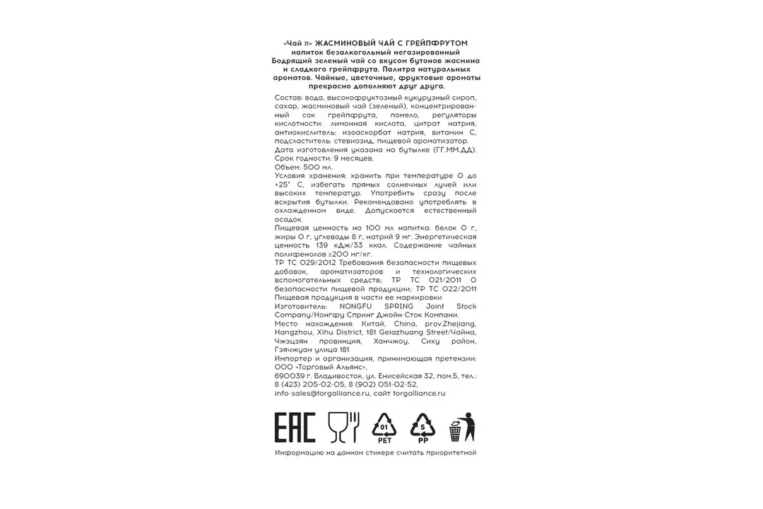 Напиток безалкогольный ЧАЙ ПИ Жасминовый с грейпфрутом 500 мл / Супермаркет