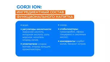 Негазированный освежающий напиток с ионами 500 мл GORJI ION помогает утолить жажду, освежиться и зарядиться новыми силами. Благодаря ионам кальция, магния, натрия, калия, этот функциональный напиток быстро восстанавливает продуктивность при любых физических нагрузках и предотвращает обезвоживание в жару. Характеристики продукта: · Питьевая вода с электролитами · Содержит пять основных электролитов (ионов): Ca2+, Mg2+, Na+, K+ и Cl- · Содержит сахар! 4,5 г на 100 мл – для лучшего усвоения ионов и заряда энергией · Для выносливости и восстановления жизненных сил · Помогает поддерживать водно-электролитный баланс в организме, особенно после тренировок · С легким цитрусовым вкусом · Не имеет ограничений по употреблению, в отличие от изотоников. pH 3,6. Страна производитель-Россия.
