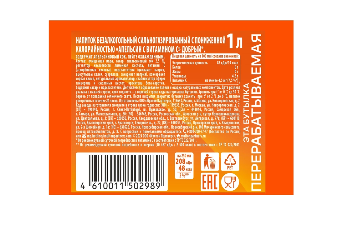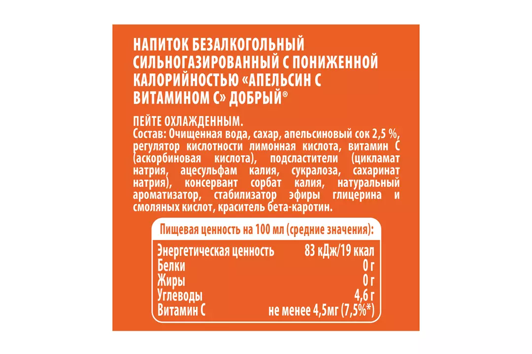 Новый сильногазированный напиток Добрый® Апельсин - сочный вкус апельсина и много пузырьков. Заряд хорошего настроения, которым хочется делиться, с тем, кто рядом. Содержит натуральный апельсиновый сок. Пейте охлажденным! Страна-производитель Россия