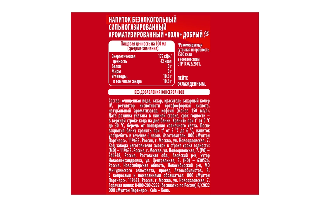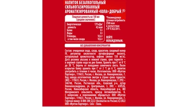 Новый сильногазированный напиток Добрый® «Кола» — это яркий и освежающий заряд хорошего настроения, которым так хочется делиться с тем, кто рядом! Пейте охлажденным! Страна-производитель Россия