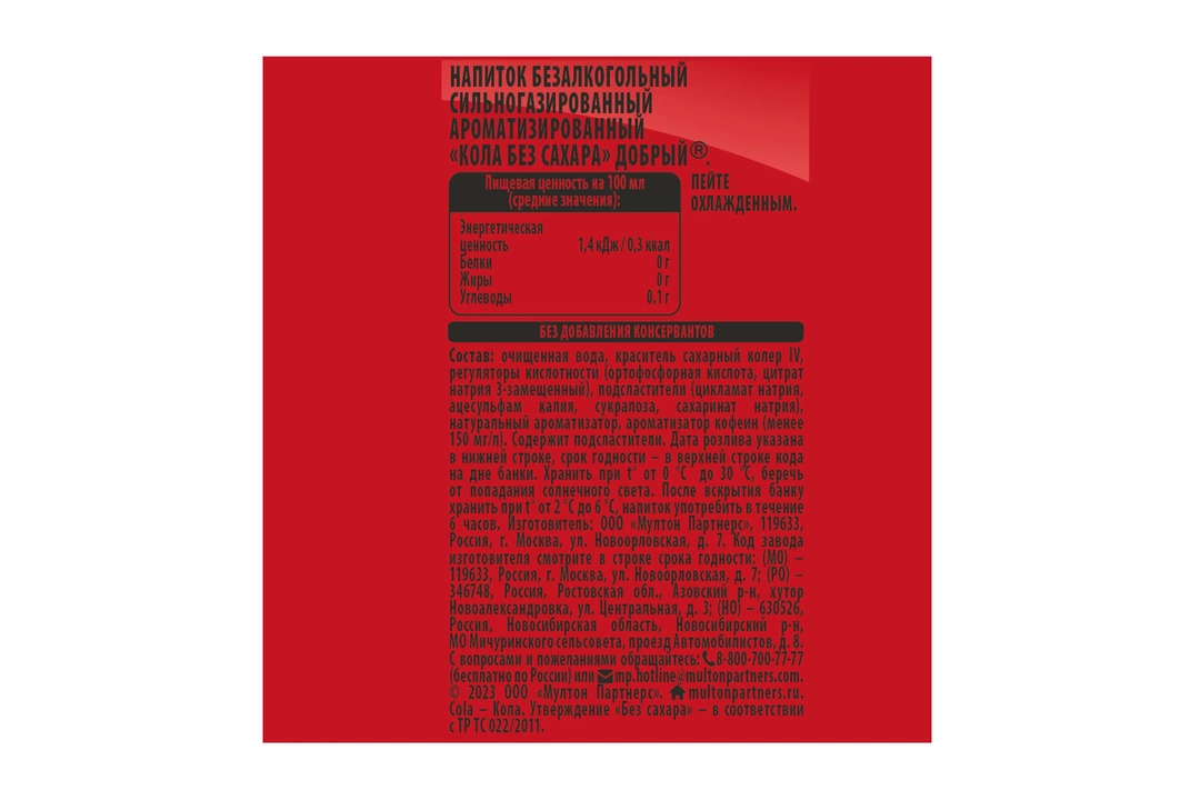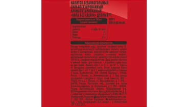 Новый сильногазированный напиток Добрый® «Кола БЕЗ САХАРА» - яркий вкус без калорий. Освежающий заряд хорошего настроения, которым так хочется делиться с тем, кто рядом! Пейте охлажденным! Страна-производитель Россия