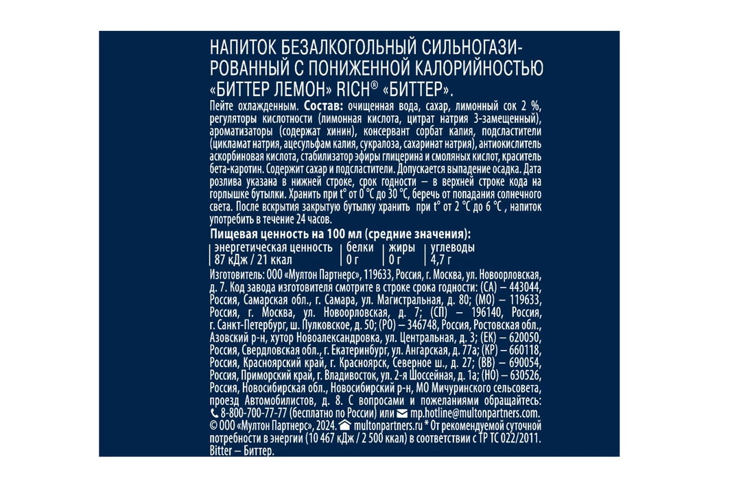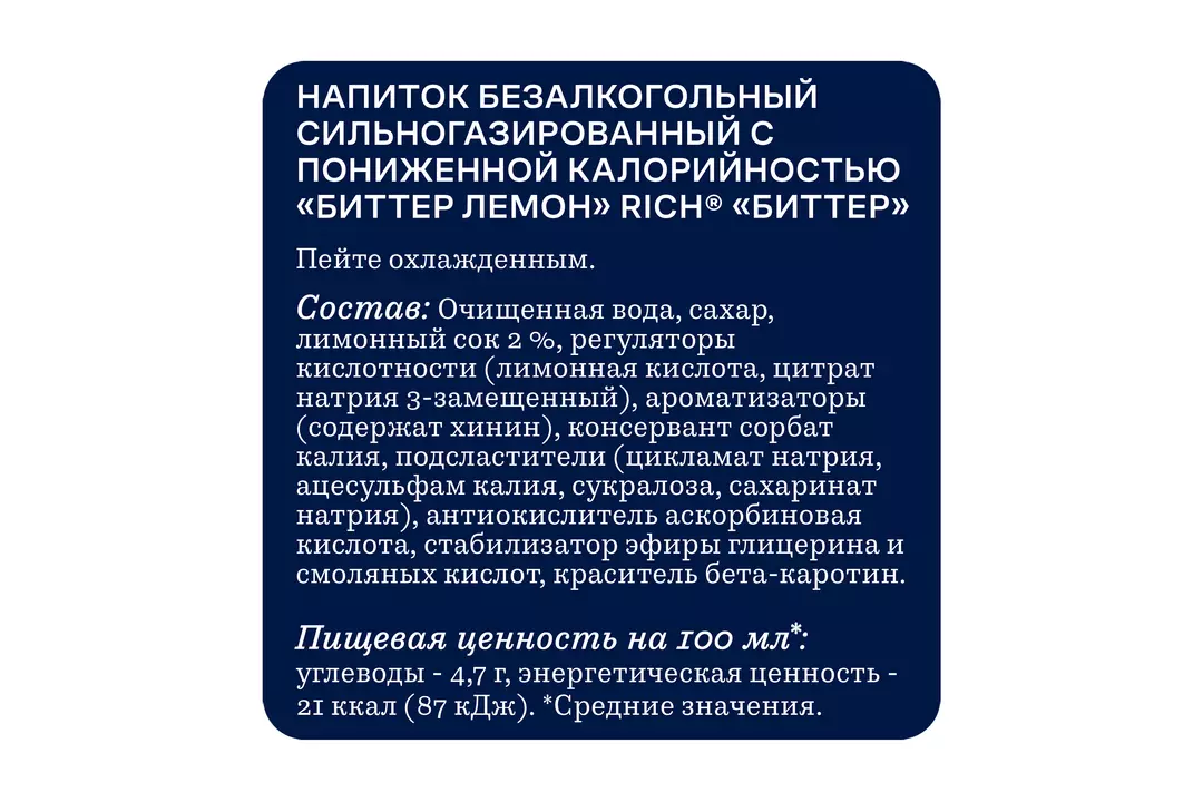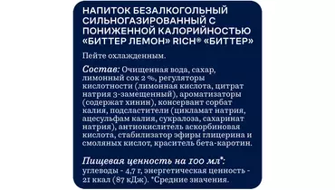 Rich Tonic&Bitter - это сильногразированные напитки высокого качества с особенным вкусом для настоящих ценителей. Rich Биттер Лемон – это классическое сочетание горьковатого вкуса тоника с нотами лимона. Отлично подойдет как самостоятельный напиток, так и в качестве ингредиента для коктейлей. Устрой встречи со вкусом! Страна-производитель Россия