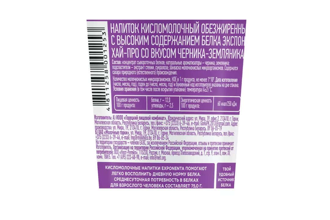 Напиток кисломолочный Exponenta High-pro Черника земляника 250 г / Супермаркет