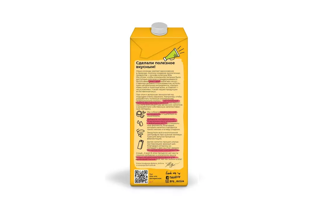Растительное молоко Bite на 100% создано из растительных компонентов по запатентованной технологии с этапом ферментации. Натуральная сладость без добавленного сахара Создано на артезианской воде c идеальным pH 7,5 Поддерживает здоровы баланс микробиоты Clean label — самый чистый состав на рынке Натуральный вкус без искусственных ароматизаторов Безопасно при инсулинорезистентности и сахарном диабете 1 и 2 типа Страна производитель-Россия