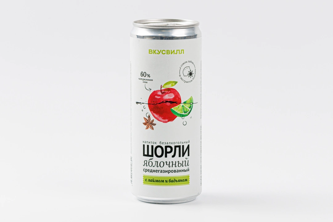 Естественный вкус фруктов, умеренная газация и суперкороткий состав без рафинированного сахара. В основе Шорли 60% яблочного сока прямого отжима, а остаток приходится на воду, сок лайма и экстракт бадьяна. Во вкусе — свежая кислинка, оттенённая терпко-сладко-пряными нотами. Допускается естественный осадок, потому что напиток натуральный. Слегка взболтайте, прежде чем открыть баночку. Изготовлен в России.
