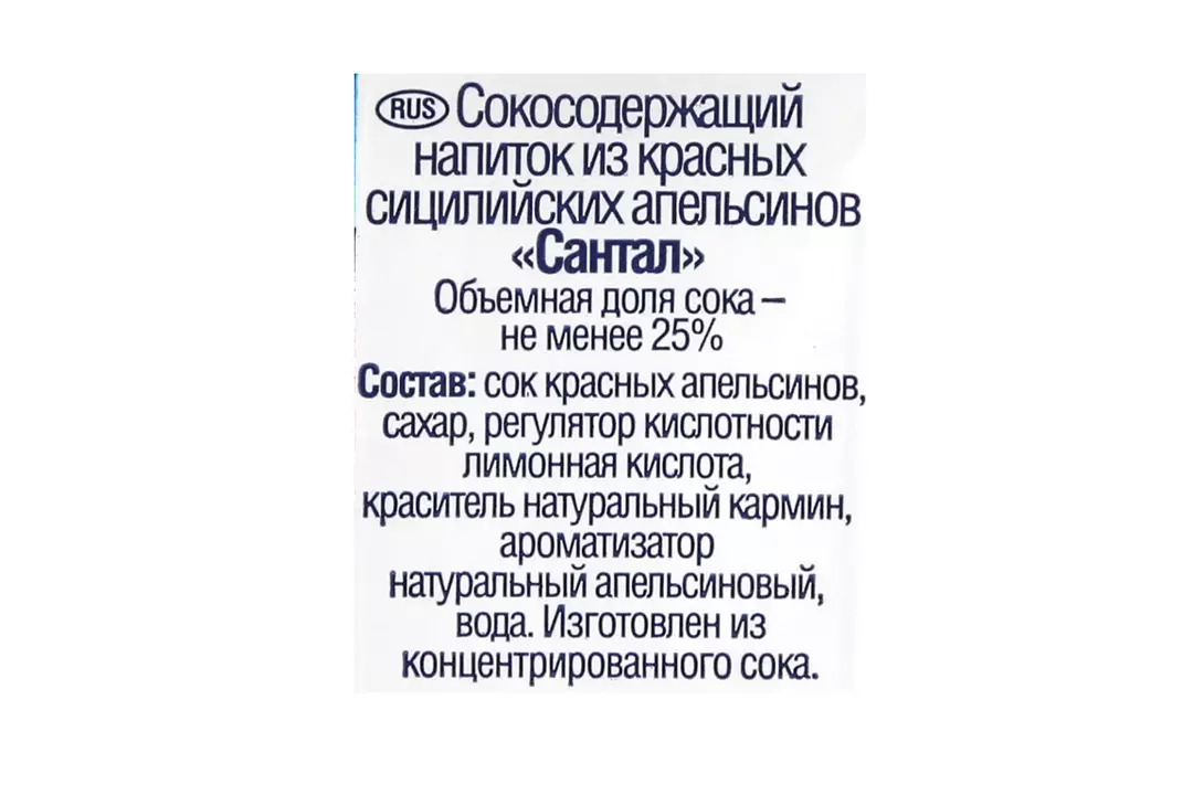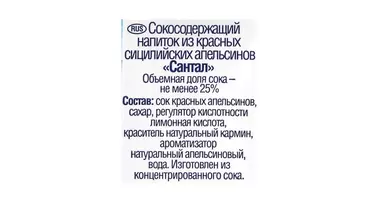 Сокосодержащий напиток Santal Красный сицилийский апельсин 250мл. Объемная доля сока - не менее 25%. Страна-производитель Россия
