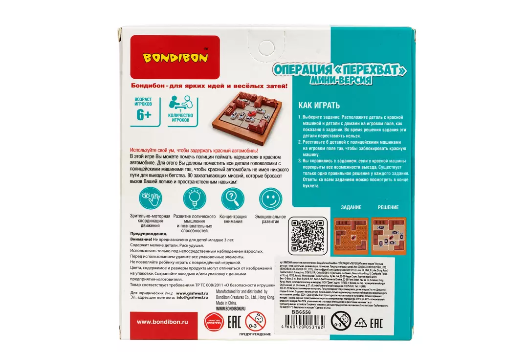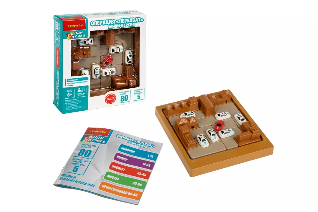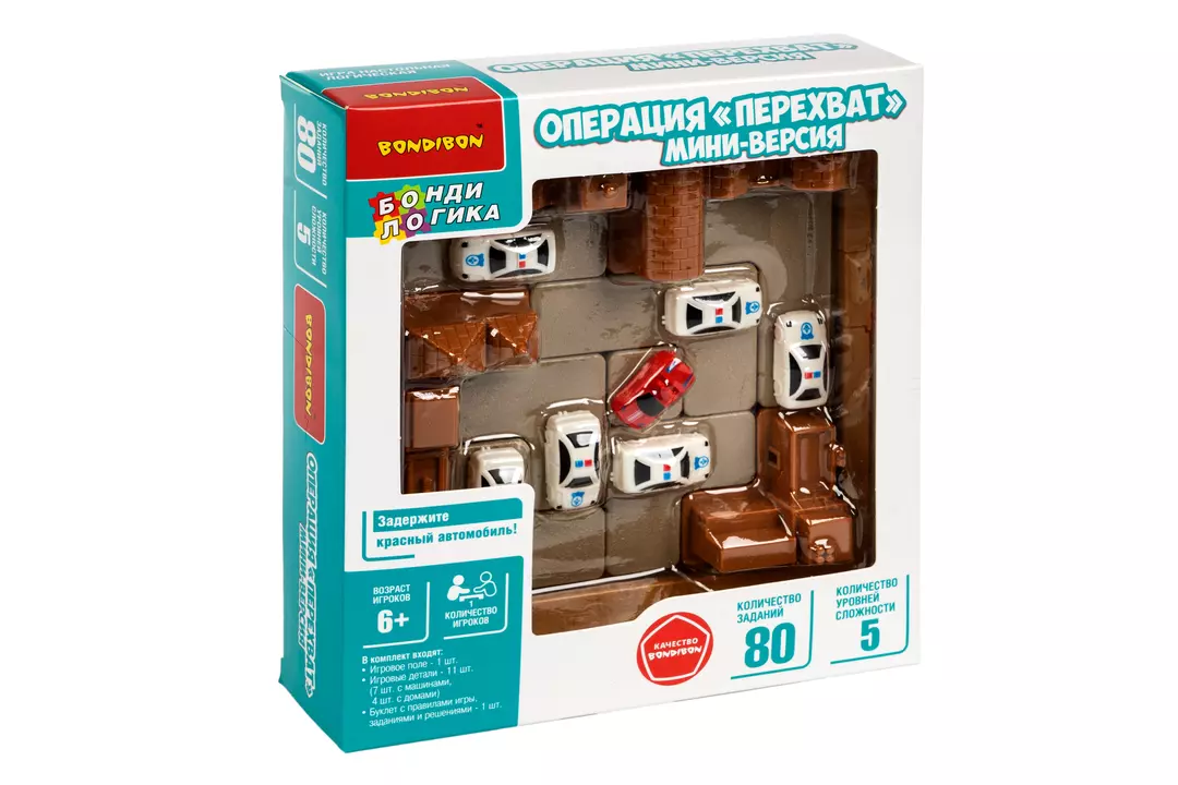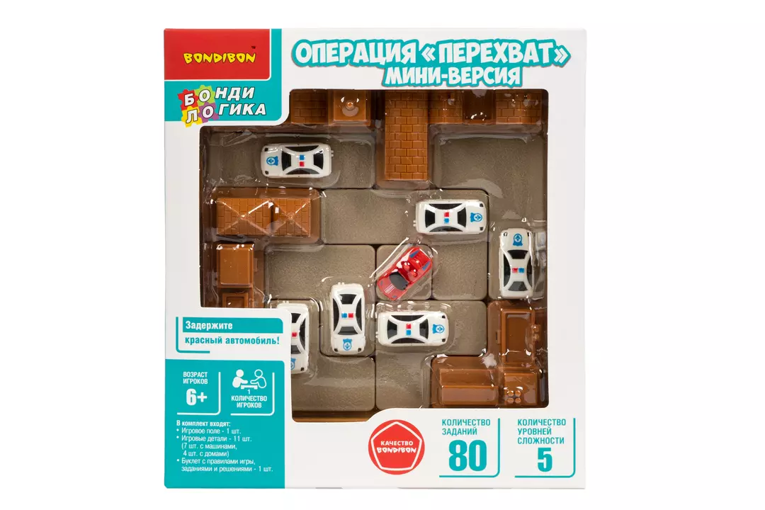 Настольная логическая игра головоломка ОПЕРАЦИЯ ПЕРЕХВАТ мини-версия серии БондиЛогика от Bondibon понравится юным полицейским! Используйте свой ум, чтобы задержать красный автомобиль. Выберите одно из 80 заданий. Расположите красную машину и дома на игровом поле указанным образом - эти детали переставлять больше нельзя. Расставьте 6 деталей с полицейскими машинами на игровом поле так, чтобы заблокировать красное авто. Если все возможности выезда перекрыты – Вы нашли верное решение! Постепенно переходите на более сложные уровни. Захватывающая головоломка от Бондибон доставит детям огромное удовольствие и поможет развить логическое мышление, координацию движений, познавательные способности, внимание и эмоциональный интеллект. Страна производитель-Китай