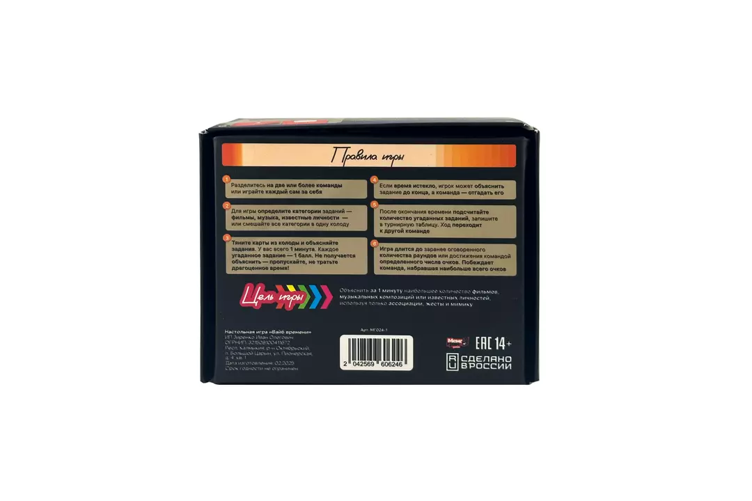 Вайб времени – это увлекательная настольная игра, которая сделает любой вечер незабываемым! Она идеально подходит для дружеских встреч, семейных посиделок, корпоративов или даже для веселья в университете. С простыми правилами и разнообразными заданиями, эта игра станет настоящим хитом в любой компании. В игре представлены три основные категории: Музыка, Фильмы и мультфильмы и Известные личности. В комплекте 200 карточек с 198 увлекательными заданиями, которые не дадут заскучать. Тяните карточку, объясняйте задание за 1 минуту и зарабатывайте баллы. Побеждает тот, кто наберет больше всего очков! Карточки выполнены из плотного материала с защитным покрытием, что делает их долговечными и удобными в использовании. Вайб времени – это настольная игра для всех, которые любят веселые и азартные развлечения, для семьи, чтобы провести время вместе и узнать друг друга лучше, для коллег, чтобы разрядить обстановку и сплотить коллектив, и для студентов, чтобы разнообразить учебные будни. Это больше, чем просто игра – это возможность узнать друг друга лучше, посмеяться от души и проверить свою эрудицию. Яркие карточки, простые правила и компактная упаковка делают Ваиб времени идеальной игрой для любого случая. Закажите игру и превратите любой вечер в незабываемое событие! Это новые эмоции, смех и радость в кругу близких людей. Страна-производитель Россия