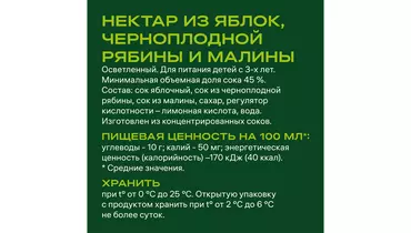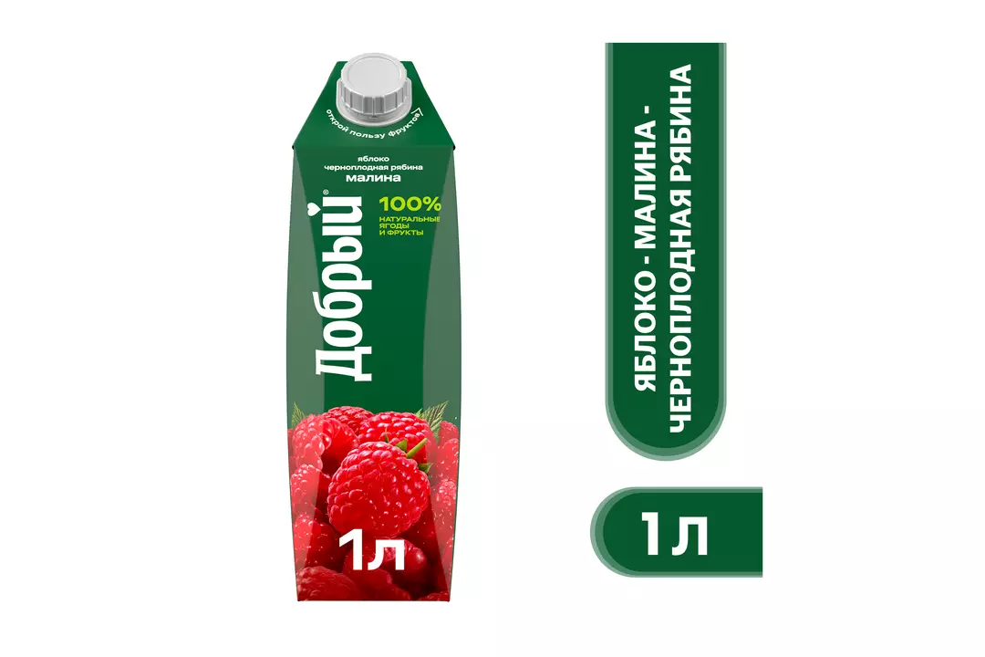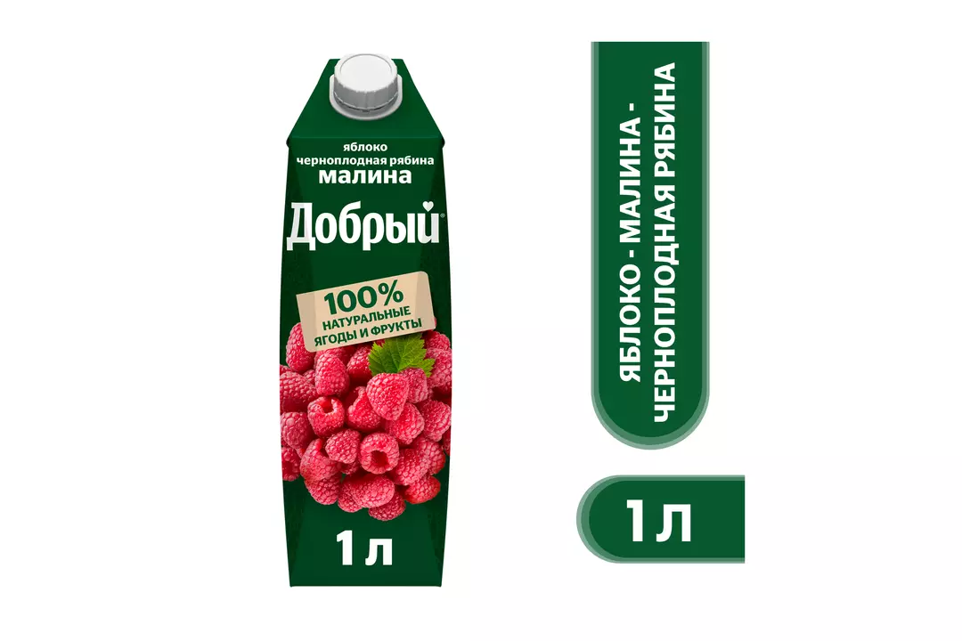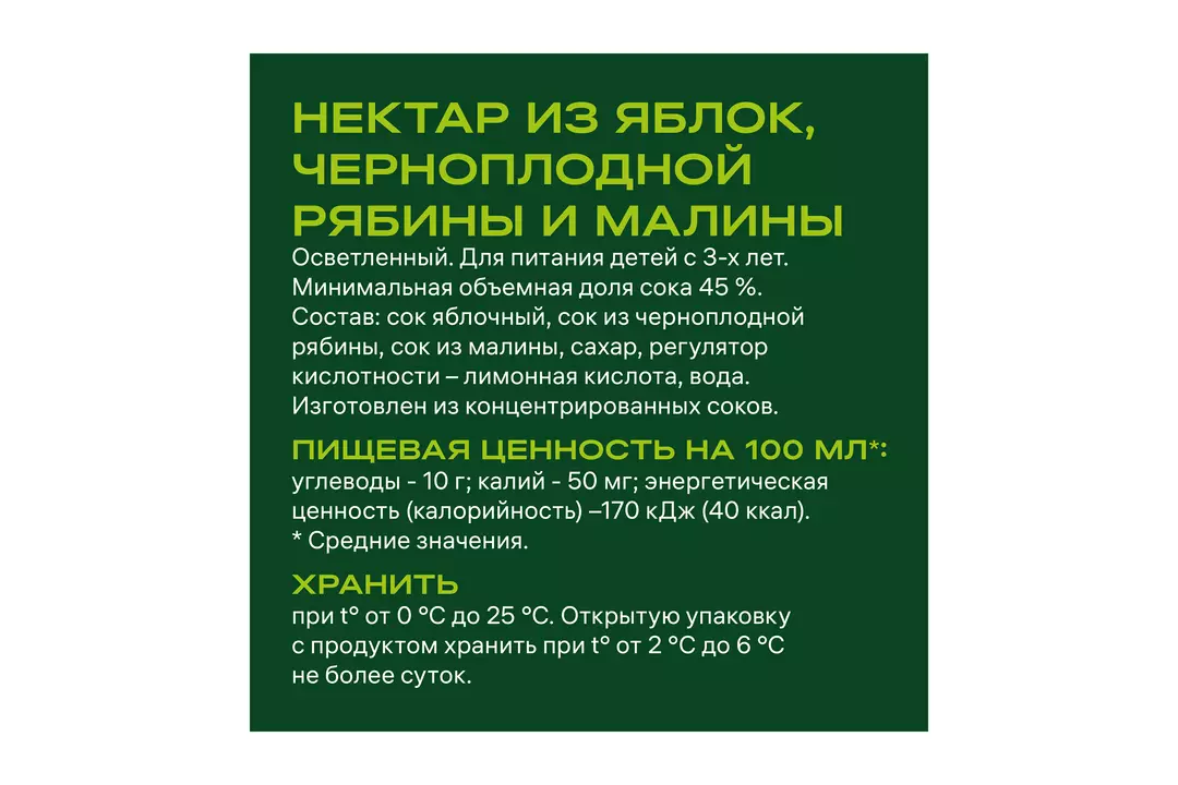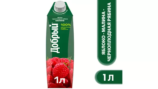 Добрый Яблоко-черноплодная рябина-малина нектар без консервантов и красителей в удобной упаковке для семейного обеда или ужина. Для питания детей с 3-х лет. Минимальная объемная доля сока 45%.