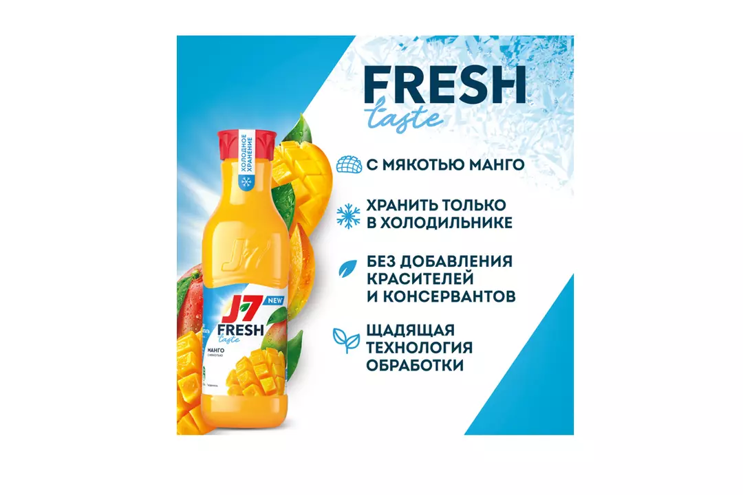 Новинка! J7 Fresh Taste из манго с мякотью. Произведен по щадящей технологии обработки. Хранить в холодильнике. Зарядись энергией и вкусом фруктов вместе с J7! J7 Fresh Taste манго это – ● экзотический вкус спелого манго с мякотью ● Щадящая технология обработки ● Содержит пюре из натурального манго ● Без красителей и консервантов ● Перерабатываемая упаковка ● Пастеризованный Страна производитель-Россия