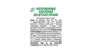 • Без красителей и консервантов • Источник калия, содержит антиоксиданты • В этой упаковке вишневого нектара J7 используется более 50 ягод спелой вишни.' '- Данные могут варьироваться в зависимости от особенностей сырья, веса фруктов и технологий производства. Страна производитель-Россия