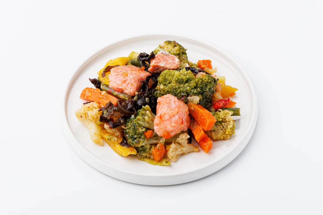 Кусочки нерки приготовлены на пару и собраны вместе с овощами, которые сохраняют и яркий цвет, и естественный вкус. Брокколи и цветная капуста получаются мягкими, но при этом чуть хрустят, морковь и перец добавляют сладковатые нотки, а древесные грибы муэр придают блюду выразительность и насыщенность. Заправка с соевым соусом, кунжутным маслом и имбирём соединяет все ингредиенты в цельный вкус с деликатным восточным акцентом. Это тот случай, когда рыба и овощи остаются простыми и узнаваемыми, но в то же время приобретают новое звучание. Блюдо напоминает о лёгкости домашнего ужина и при этом несёт в себе характер азиатской кухни.