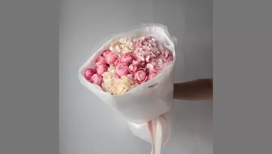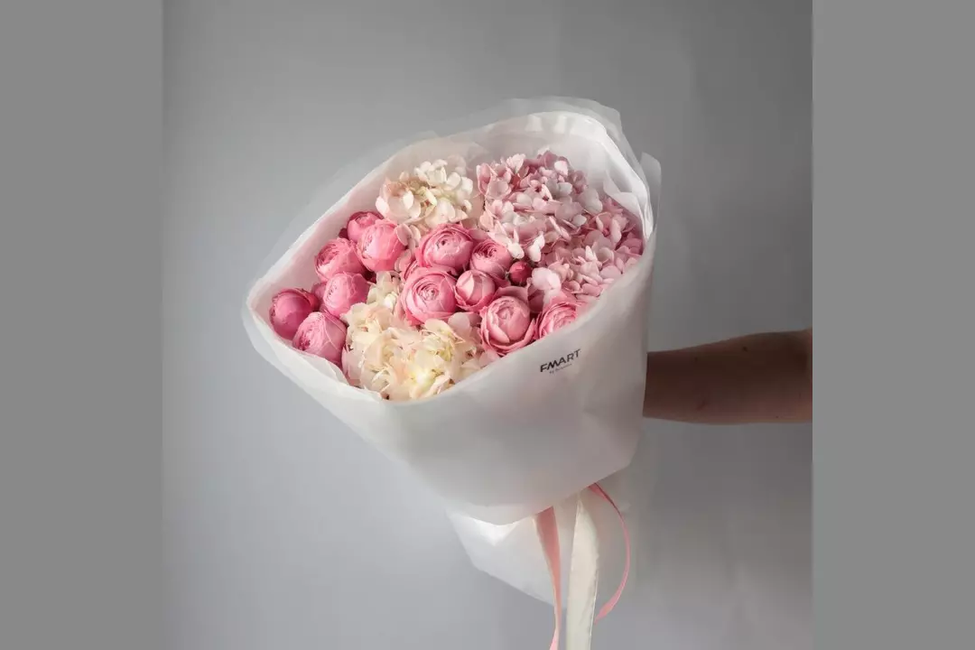 Нежный букет с гортензией и кустовыми пионовидными розами FMART by flowwow