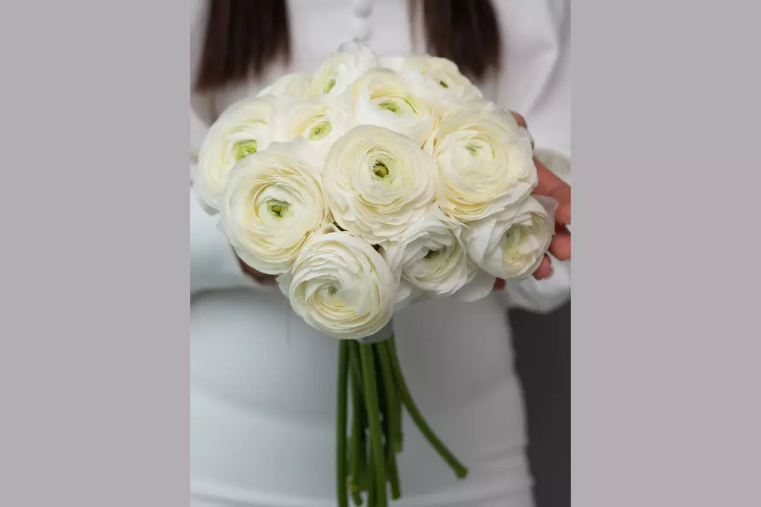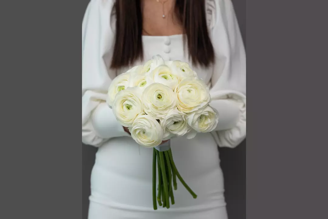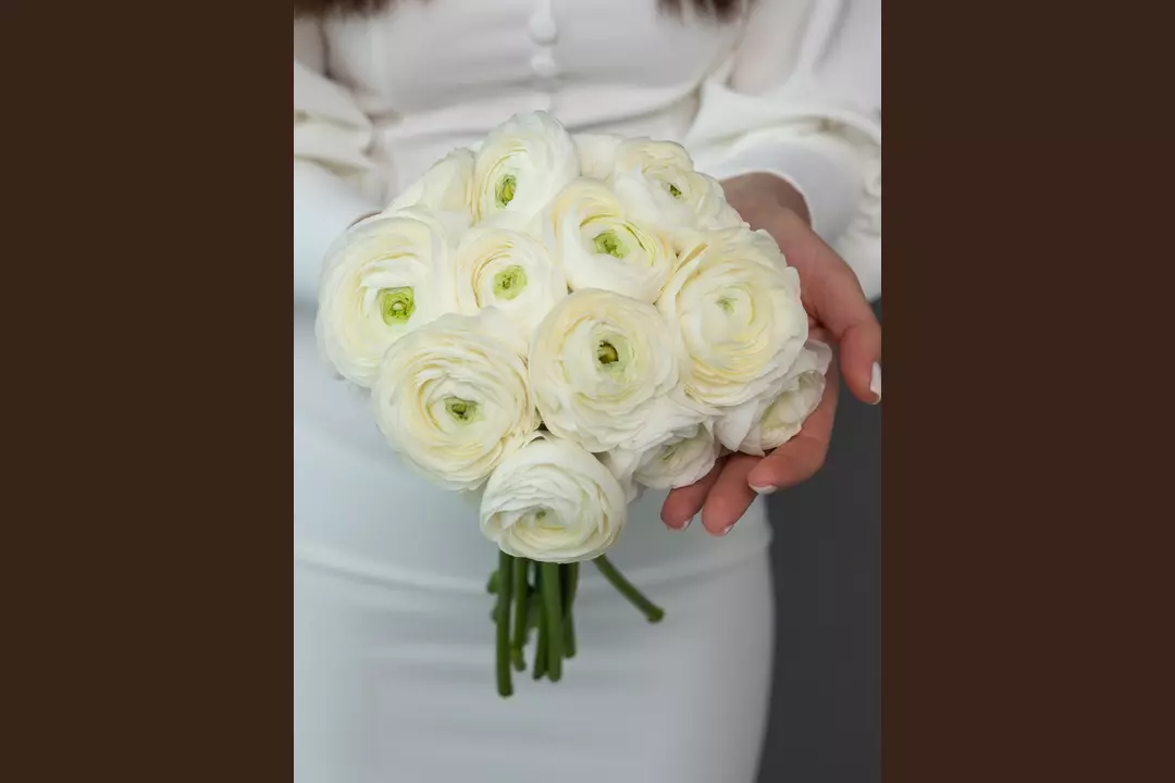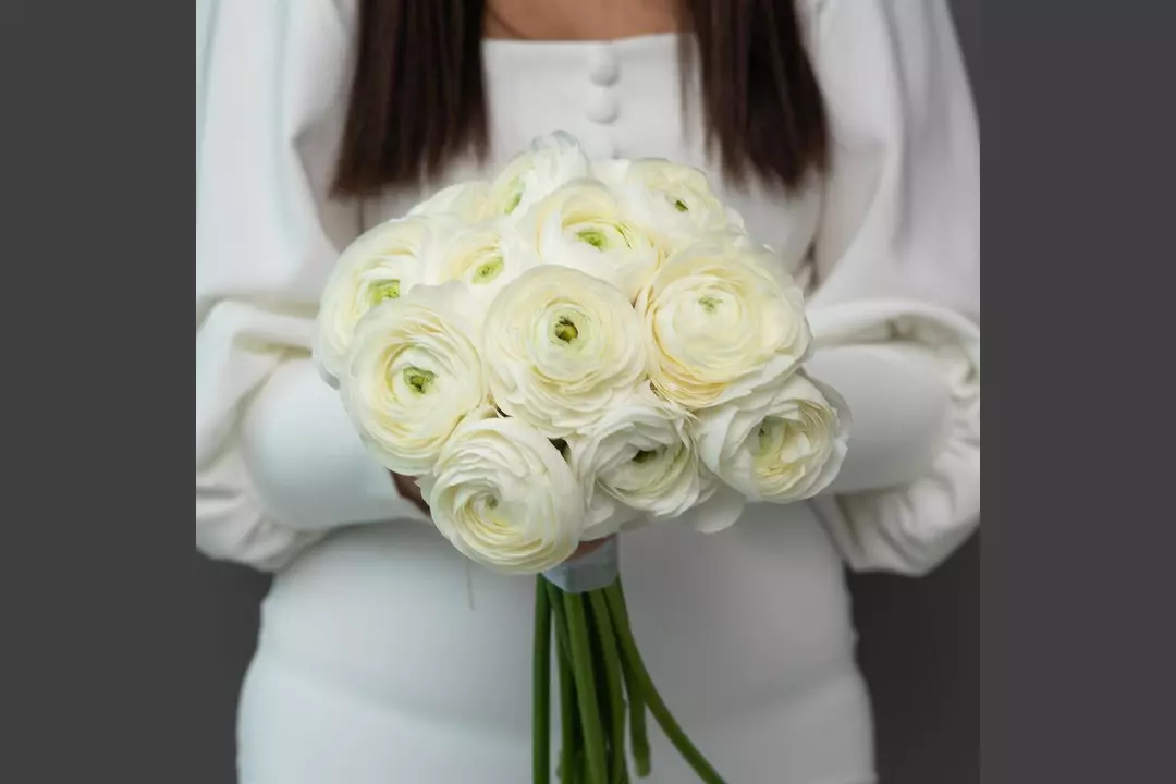 Представляем вам изысканный свадебный букет, олицетворяющий чистоту, нежность и элегантность – монобукет из белоснежных ранункулюсов. Этот букет создан для того, чтобы подчеркнуть нежность и утонченность невесты в самый важный день ее жизни. Сердцем этой композиции являются 15 великолепных ранункулюсов, чей белоснежный цвет символизирует чистоту и невинность. Пышные, многослойные лепестки этих цветов создают впечатление легкости и воздушности, а их изысканная форма притягивает взгляд. Каждый ранункулюс, словно маленькое чудо, сияет своей безупречной красотой. Чтобы подчеркнуть чистоту и минимализм композиции, букет перевязан белоснежной атласной лентой, которая придает ему дополнительный шарм и изысканность. Лента также обеспечивает удобство при ношении букета, позволяя невесте чувствовать себя комфортно и уверенно. Высота букета составляет 35 см, а ширина – 30 см. Этот компактный размер делает его удобным в использовании, позволяя невесте наслаждаться своим праздником, не беспокоясь о неудобствах. Этот свадебный букет из белых ранункулюсов – идеальный выбор для невесты, которая ценит элегантность, простоту и утонченный вкус. Он станет прекрасным дополнением к свадебному образу, подчеркивая ее красоту и нежность, а также создаст незабываемые воспоминания о самом счастливом дне.