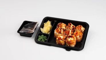 основа (водоросли Нори сушеные, рис (крупа рисовая отварная (вода питьевая, крупа рисовая шлифованная, соус для риса (уксус рисовый (уксус рисовый, уксус спиртовой, вода питьевая, сахар, соль пищевая), сахар, соль пищевая)), сыр творожный м.д.ж в сухом веществе 65% (творог (нормализованное пастеризованное молоко, бактериальная закваска, молокосвертывающий фермент микробного происхождения), загуститель- модифицированный крахмал, соль пищевая, стабилизаторы (камедь рожкового дерева, гуаровая камедь), регулятор кислотности лимонная кислота, вода питьевая), огурец свежий), спайс лосось (лосось атлантический (семга) слабосоленый (лосось атлантический (семга) (продукция аквакультуры, произведено из охлажденного сырья), соль пищевая, сахар), соус спайс (майонез мдж 67% ( масло подсолнечное и масло оливковое рафинированное дезодорированное, вода питьевая, сахар, яичный желток жидкий, соль пищевая, лимонный сок прямого отжима, уксус спиртовой 20 %, горчичное мало нерафинированное), соевый соус (вода питьевая, соевые бобы, пшеница, соль, сахар), перец красный молотый)), соус манго (пюре манго (манго, сахар, регулятор кислотности - лимонная кислота, аскорбиновая кислота), майонез мдж 67% (масло подсолнечное и масло оливковое рафинированное дезодорированное, вода питьевая, сахар, яичный желток жидкий, соль пищевая, лимонный сок прямого отжима, уксус спиртовой 20 %, горчичное мало нерафинированное), соус сладкий Чили (сахар, вода, перец чили 22%, соль, чеснок, загуститель кукурузный крахмал, регулятор кислотности уксусная кислота ледяная, загуститель ксантановая камедь), соус унаги (вода, сахар, соус соевый (вода, соя, пшеница, соль, мука пшеничная), загуститель модифицированный крахмал, краситель пищевой сахарный колер 1 простой, консервант сорбат калия)), соус унаги (вода, сахар, соус соевый (вода, соя, пшеница, соль, мука пшеничная), загуститель модифицированный крахмал, краситель пищевой сахарный колер 1 простой, консервант сорбат калия), смесь специй "шичими" (перец красный, перец черный, апельсиновая цедра, кунжут, имбирь, морские водоросли), соус соевый (вода питьевая, соевый соус (вода питьевая, соевые бобы, пшеница, соль, сахар), сахар), имбирь маринованный (корень имбиря свежий, уксус рисовый (уксус рисовый, уксус спиртовой, соль, сахар), соль, сахар), васаби (вода питьевая, васаби порошок (порошок хрена, горчичный порошок, крахмал кукурузный, соль пищевая, антиокислитель-аскорбиновая кислота), порошок спирулины). Продукция производится на предприятии, где используются рыба, моллюски, ракообразные, яйца, молоко, кунжут, сельдерей, орехи, злаки и продукты их переработки. Возможно попадание в продукт фрагментов костей рыбы.