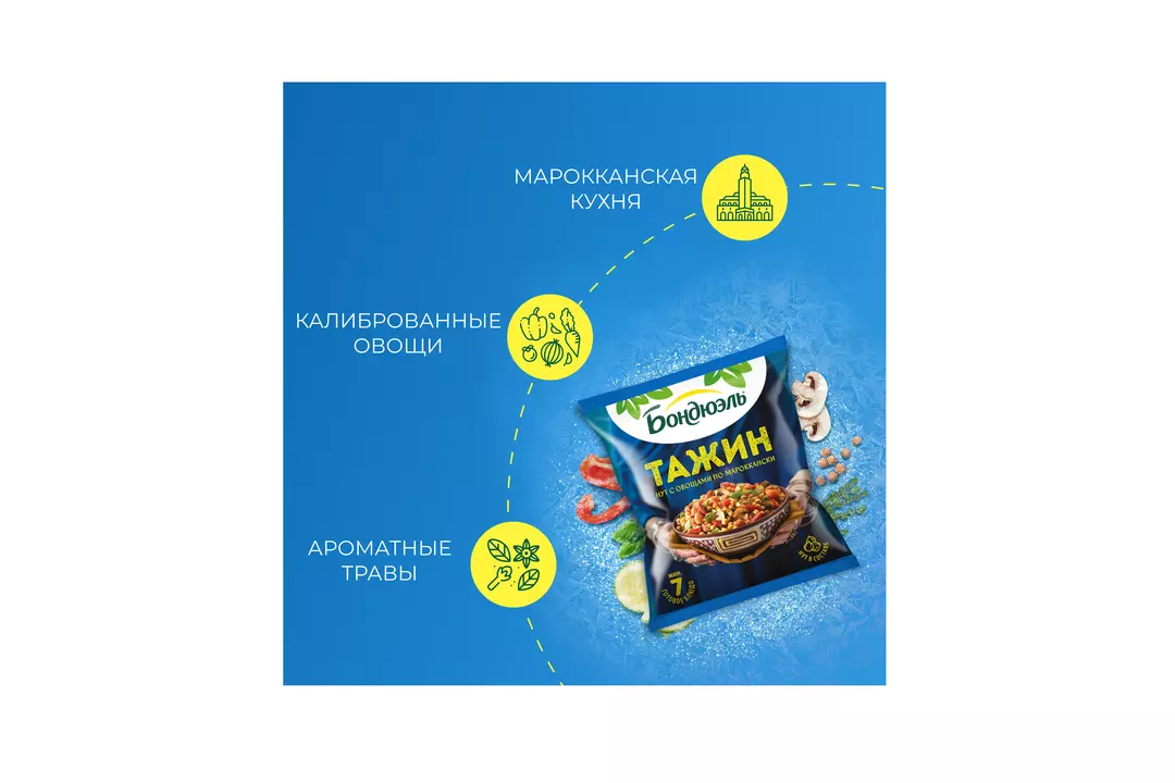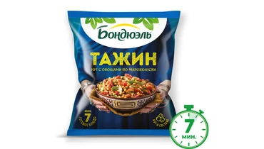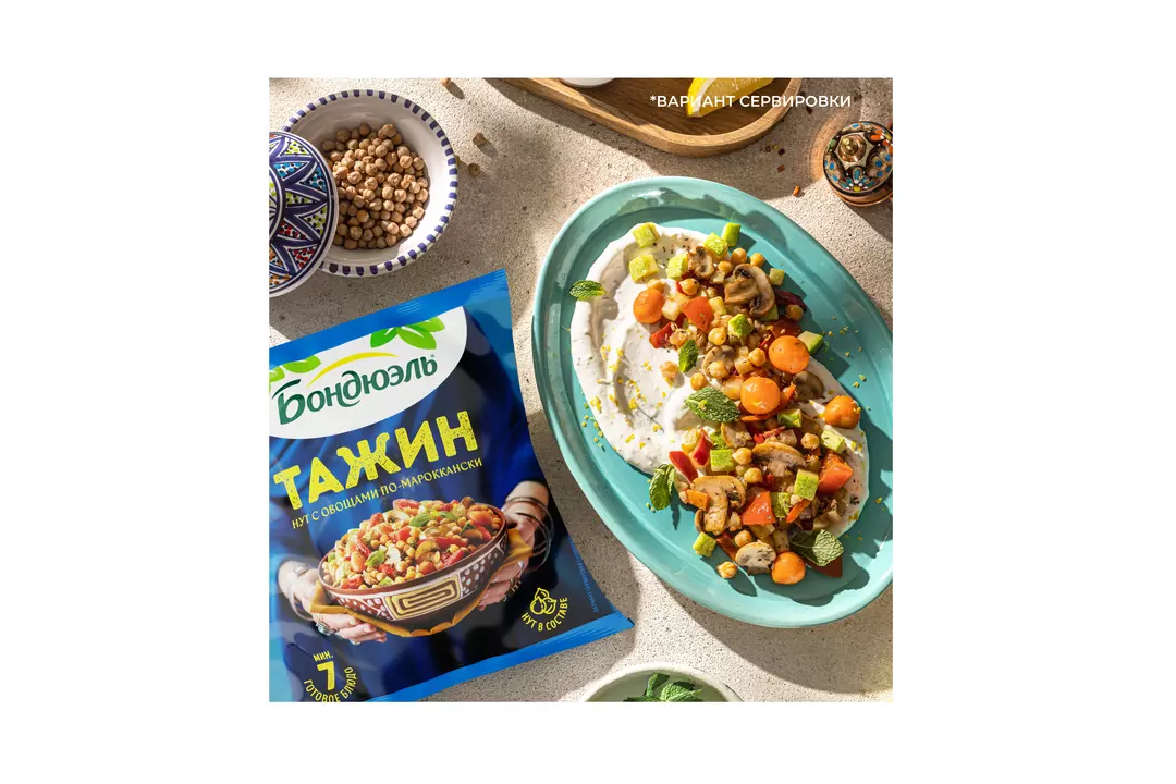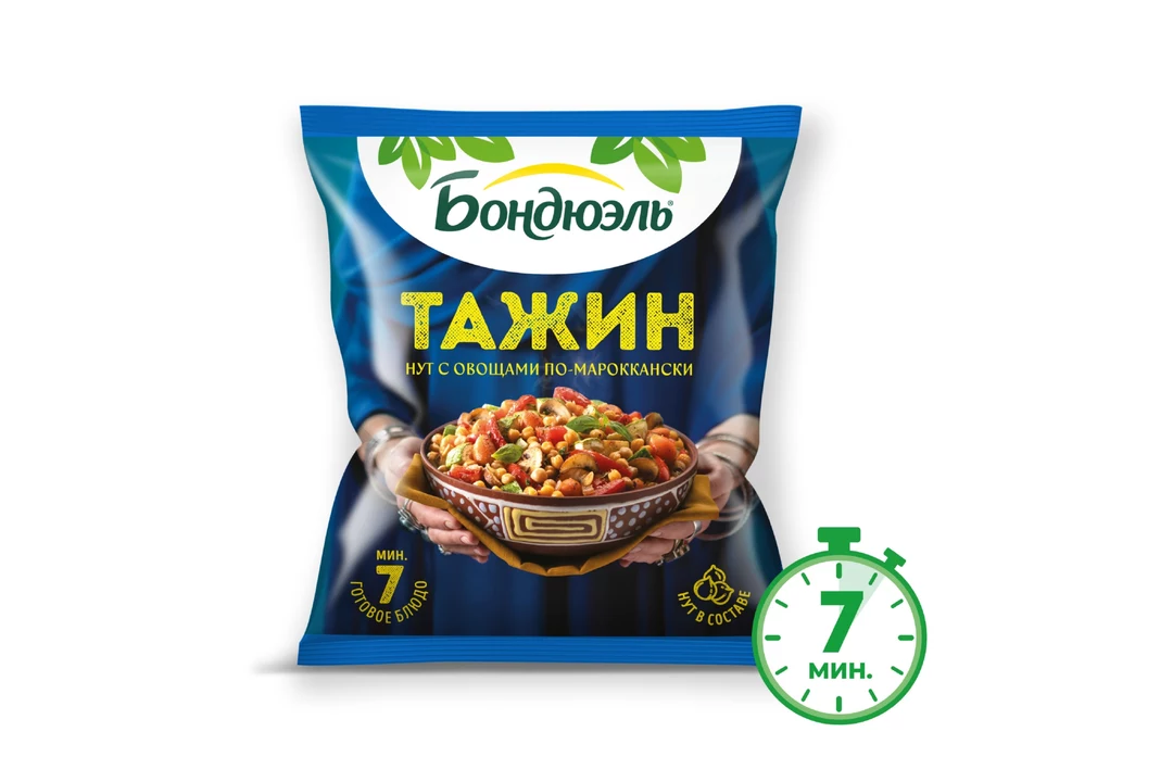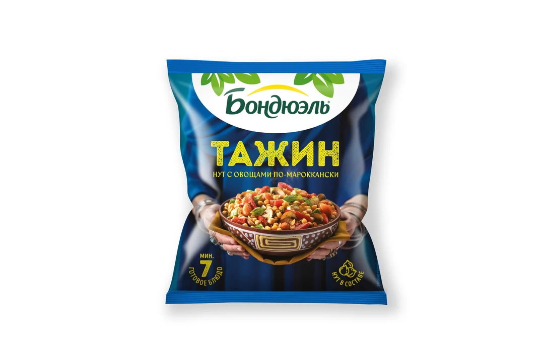 Тажин - аутентичное блюдо марокканской кухни. Нежный нут с легким ореховым оттенком и сочные овощи, сохранившие полезные свойства. Аналогичное название носит традиционная посуда с высокой конусообразной крышкой. Попробуйте аутентичный нут с овощами по-мароккански, а правильное настроение Бондюэль берет на себя! Страна производитель-Россия