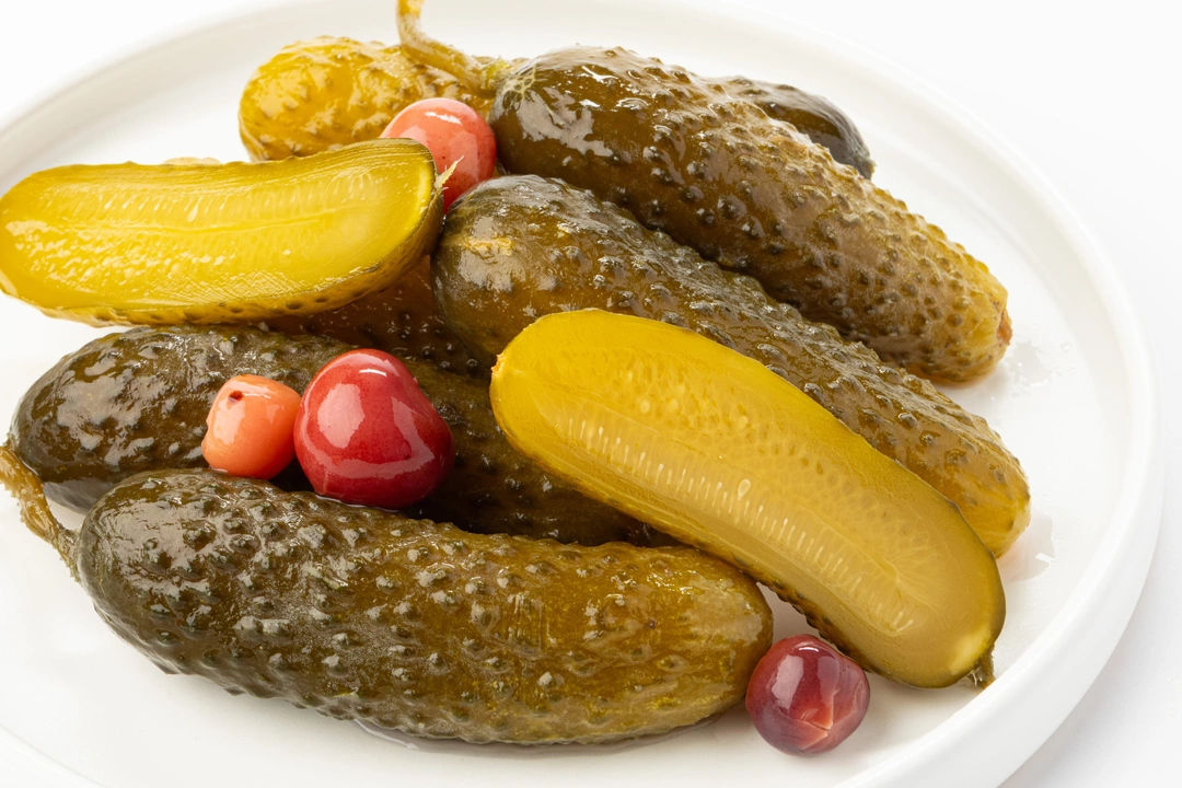 Солёные огурцы приобретают необычную ягодную ноту благодаря добавлению вишни. Хруст сохраняется, а вкус становится более объёмным: сочная кислинка ягод мягко оттеняет солёный рассол и пряный акцент укропа с хреном. Вишня добавляет лёгкий цвет и едва заметную сладость. Такой вариант подойдёт для закусочного стола, мясных блюд или как необычное дополнение к праздничному обеду.