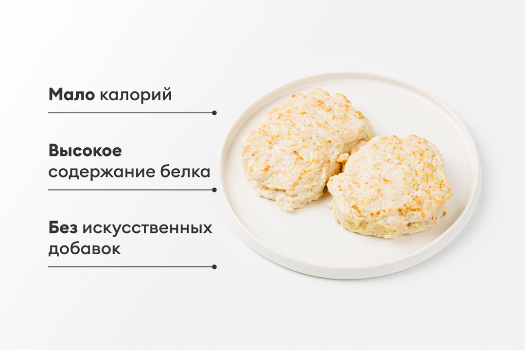 Два мягких оладушка из куриной грудки. В мясной фарш добавляют сочный измельчённый кабачок и немного майонеза, поэтому текстура и вкус такие нежные. Отлично сочетаются с овощными салатами и любым гарниром.
