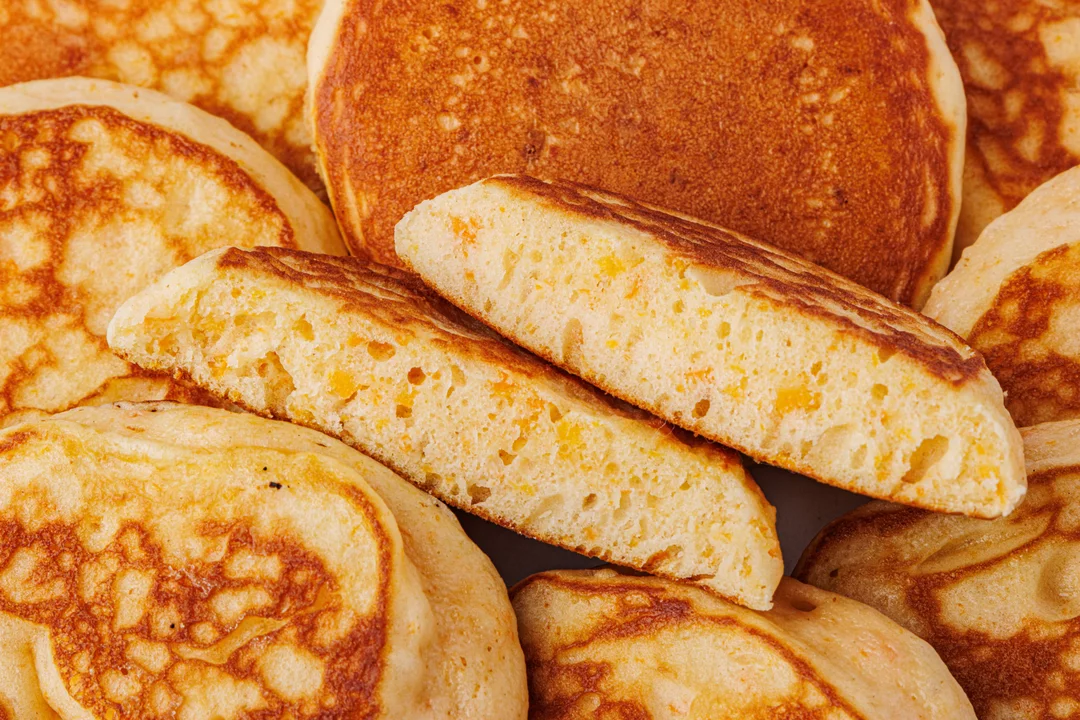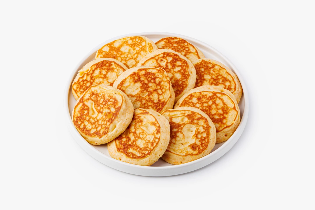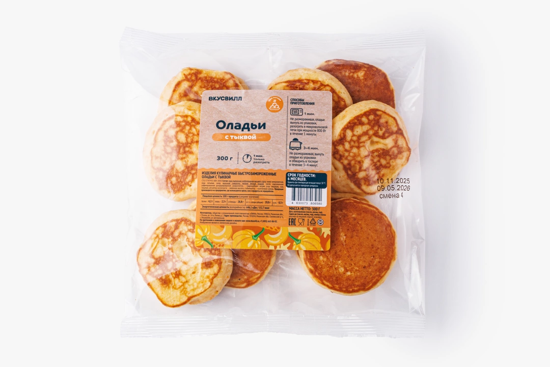 Пышные и румяные оладьи из тыквенного теста на молочной сыворотке напоминают панкейки. Продукт полностью готов и заморожен, вам нужно только разогреть его в течение нескольких минут в микроволновой печи или в тостере, следуя инструкции. Оладьи хороши как десерт или сытный и вкусный завтрак. Подавайте их с кофе, чаем или какао, дополнив мёдом, сметаной, фруктовым сиропом или любимым вареньем. Не содержат искусственных ароматизаторов.