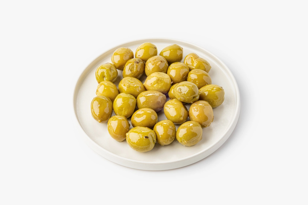 Крупные зелёные оливки сорта Халкидики с плотной мясистой мякотью и выраженным вкусом. Косточка сохраняет естественную структуру плода, а нерафинированное оливковое масло подчёркивает солоноватость и аромат. Вкус насыщенный, но сбалансированный, с лёгкими травяными нотами орегано. Используем сырьё из Греции. Масса основного продукта 190 г.