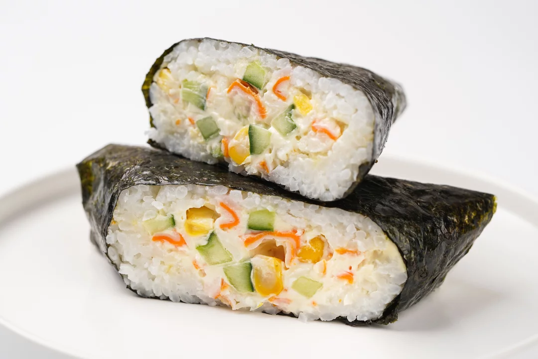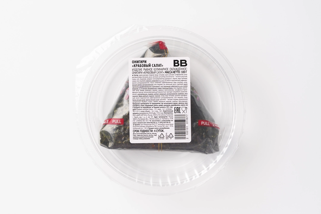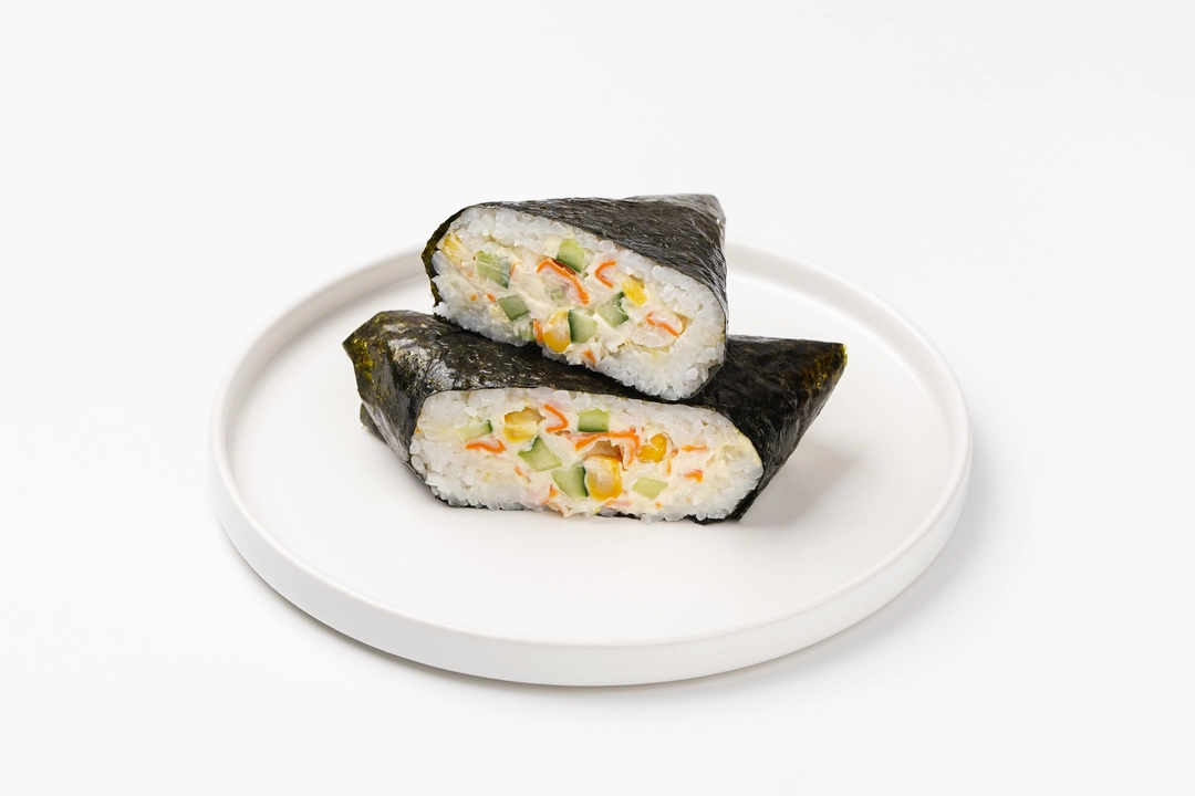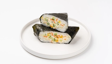 Любимый крабовый салат в новом формате. Микс из сурими, свежих огурцов и сладкой кукурузы завёрнут в рисовый треугольник и лист морских водорослей. В качестве заправки мы добавили творожный сыр и немного майонеза. Чтобы оболочка оставалась хрустящей, мы придумали специальную изолирующую упаковку. Просто потяните за ленточку до конца, а затем за уголки аккуратно снимите половинки пакета. Это удобный и сытный перекус для будней в офисе, долгих прогулок и путешествий.