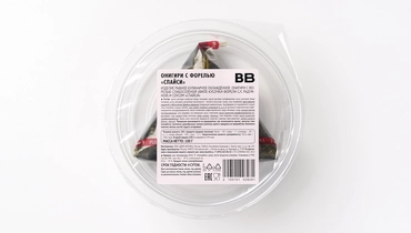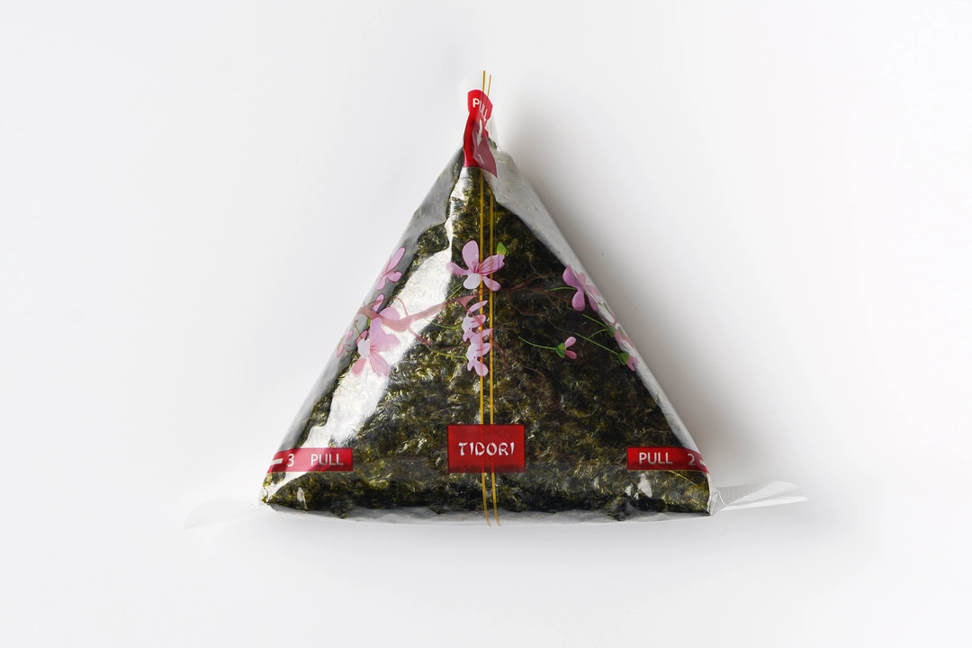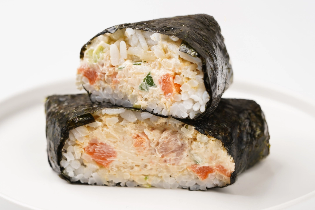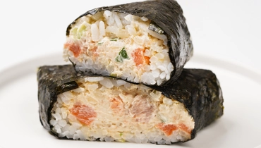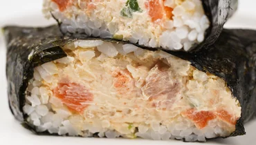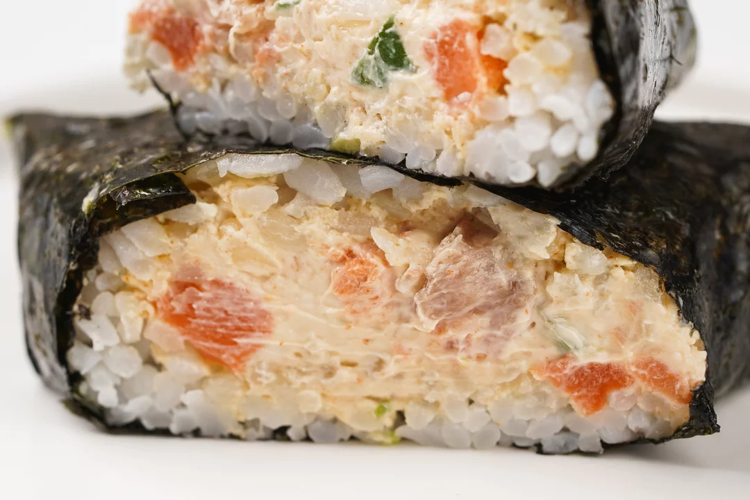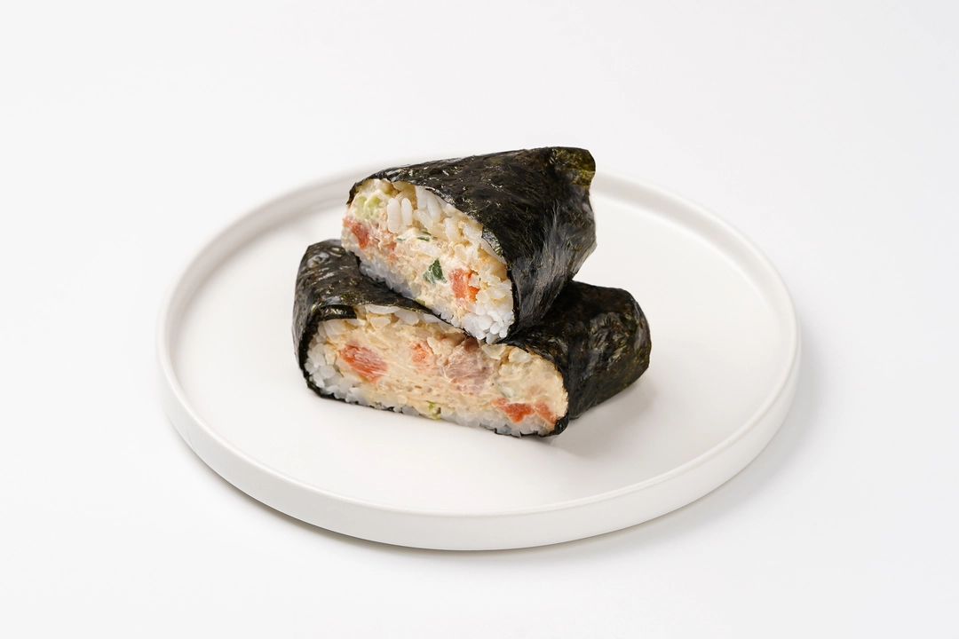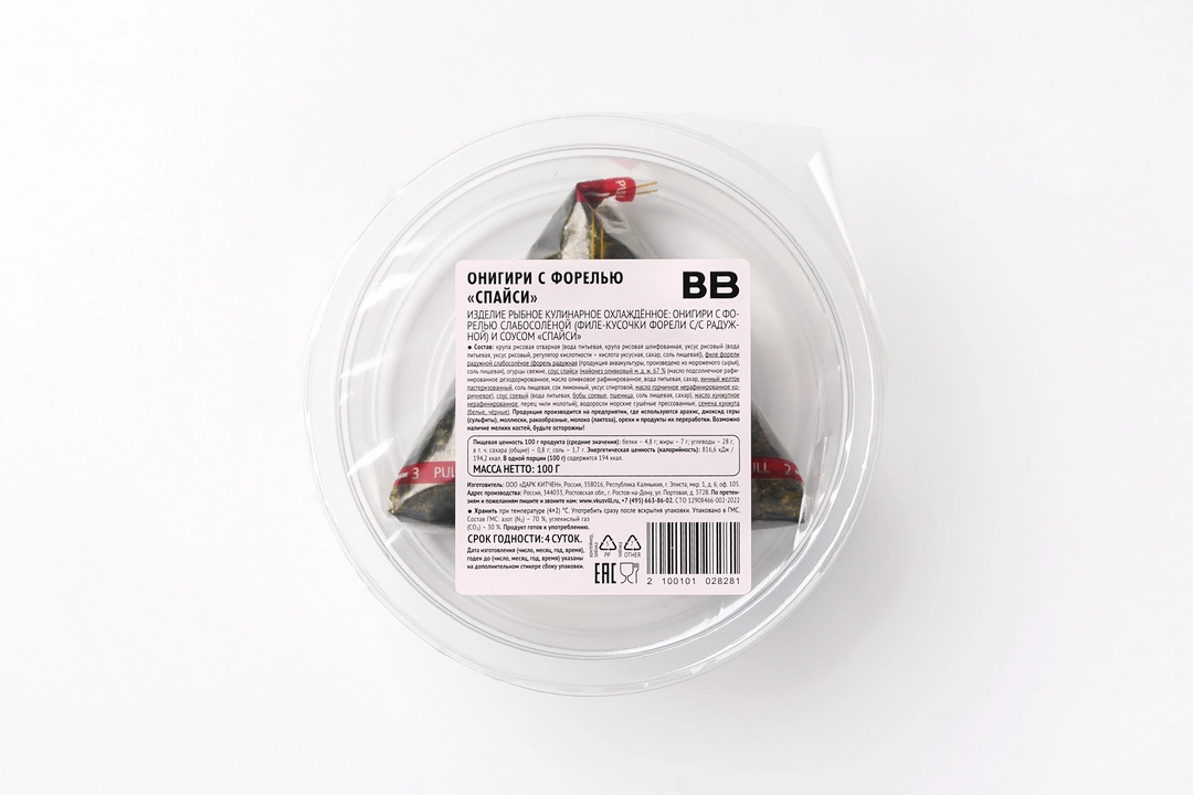 Онигири с форелью «Спайси» — треугольник из риса с нежной слабосолёной рыбой и острым соусом на основе майонеза и кунжутного масла. Форель даёт сочность и лёгкую маслянистость, перец чили добавляет пикантность, а свежий огурец делает вкус чище и ярче. Всё это завернуто в лист нори и дополнено кунжутом для баланса и аромата.