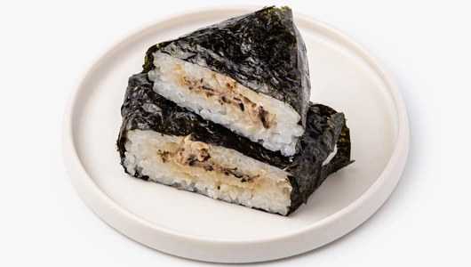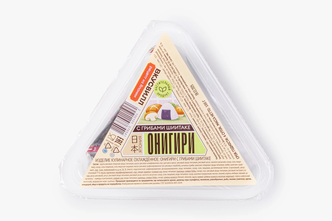 Онигири — это японские рисовые треугольники с начинкой внутри, которые удобно держать в руках. Рис для них мы заправляем рисовым уксусом и морской солью, чтобы он приобретал нужную консистенцию. Внутрь прячем начинку из грибов шиитаке: их смешиваем с соусом терияки, кунжутной пастой тахини и кайенским перцем — получается насыщенный, чуть островатый вкус с ореховыми нотками. Каждый треугольник мы оборачиваем водорослями нори, чтобы его было удобно есть. Онигири хорош в качестве лёгкого обеда, когда еда становится маленьким ритуалом, даже если вы просто перекусываете на ходу
