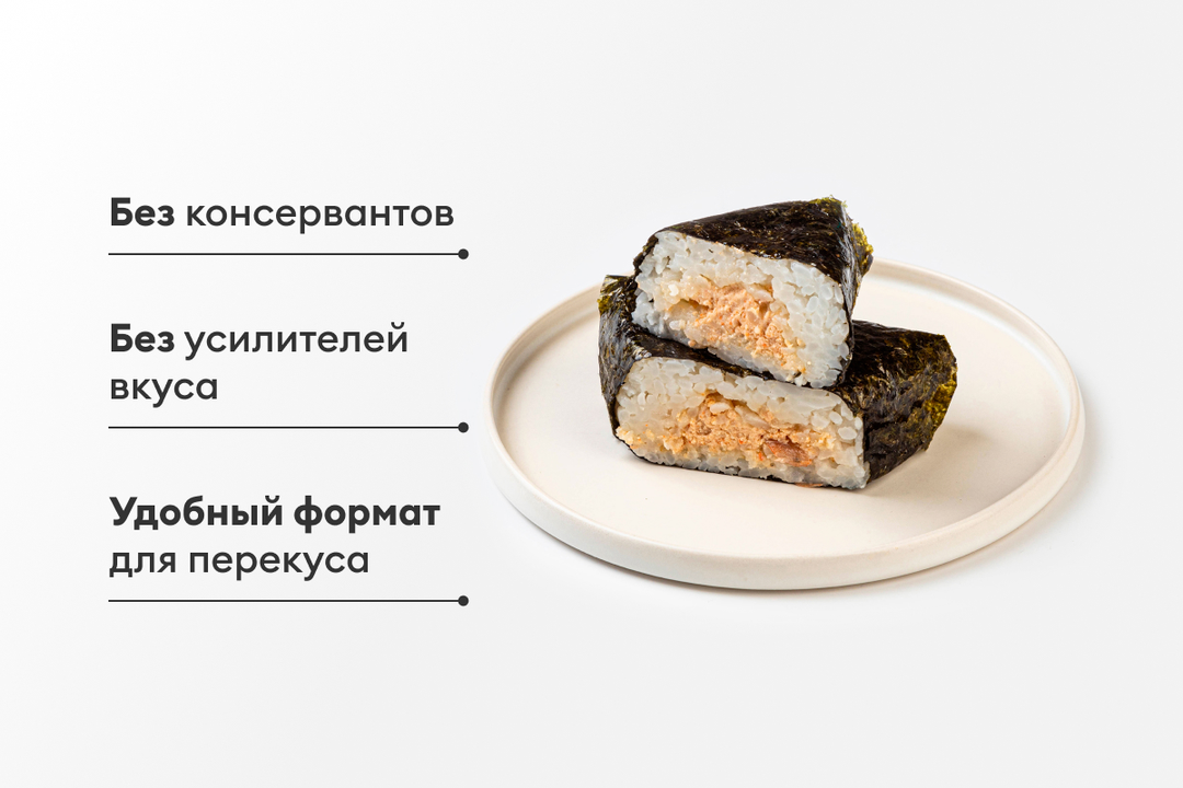 Треугольный рисовый сэндвич, которым удобно перекусить даже на ходу. Состав проверен: нет консервантов и усилителей вкуса