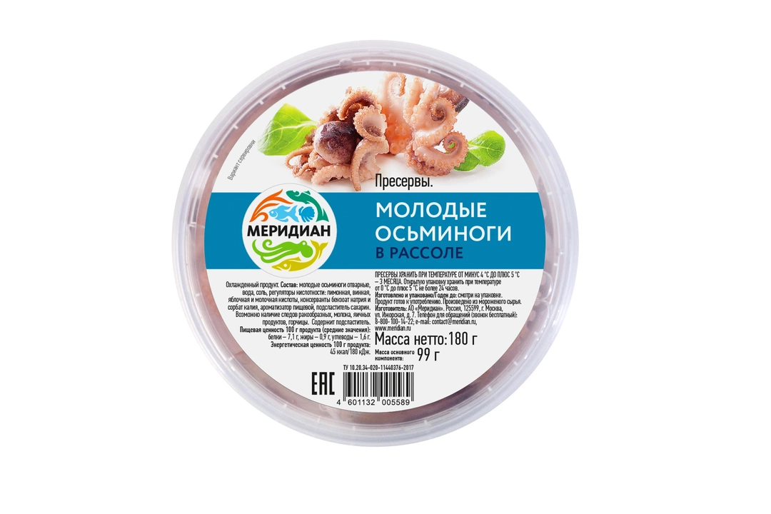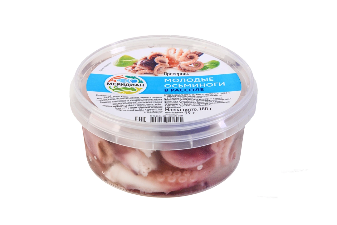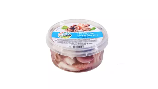Молодые осьминоги , или беби-осьминоги это не только вкусный и необычный деликатес, а богатейший источник белка с высокой биологической активностью. Кроме того в мясе осьминога обнаружены важнейшие для здоровья человека витамины: тиамин, рибофлавин , а также микроэлементы. Молодые осьминоги «Меридиан» в рассоле без добавления специй и пряностей позволяют сохранить естественный и натуральный вкус осьминожек. Продукт представлен в удобной пластиковой банке. Страна-производитель Россия