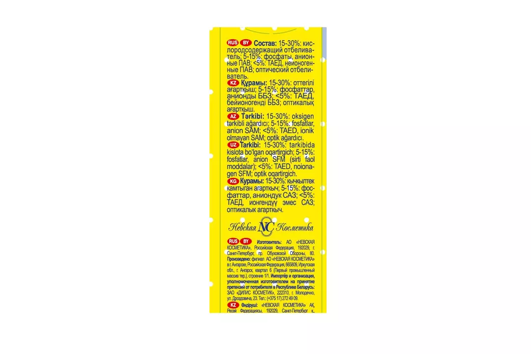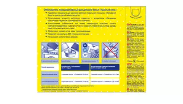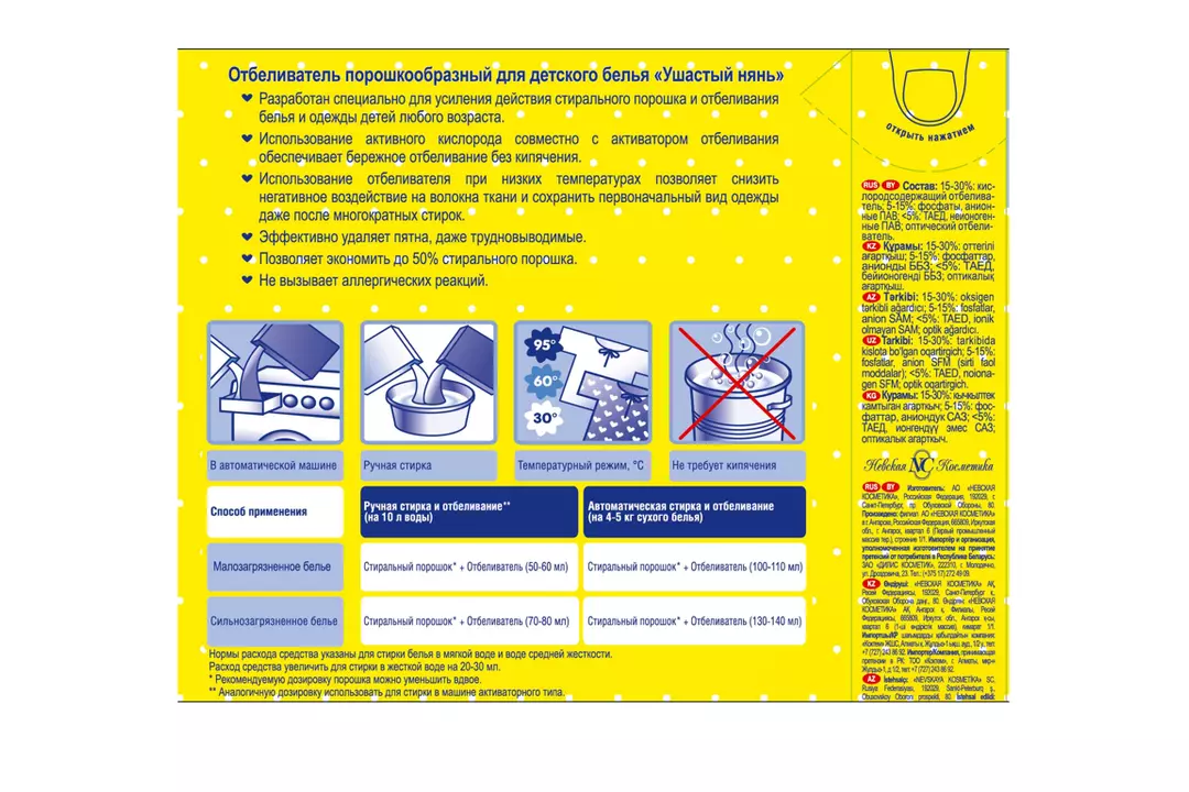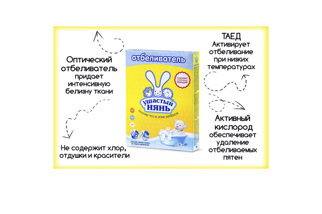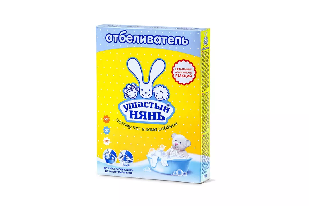 Отбеливатель «Ушастый нянь» усиливает действие стирального порошка при выведении пятен с одежды детей любого возраста, в том числе новорожденных. Он прекрасно работает без кипячения при низких температурах и сохраняет первоначальный вид вещей даже после многократных чисток. Восстанавливает белизну вещей, предназначен для различных видов тканей, не содержит хлор. Средство не вызывает аллергических реакций, доказано ФГУ «РНИИТО им. Р. Р. Вредена Росмедтехнологий». Страна-производитель Россия
