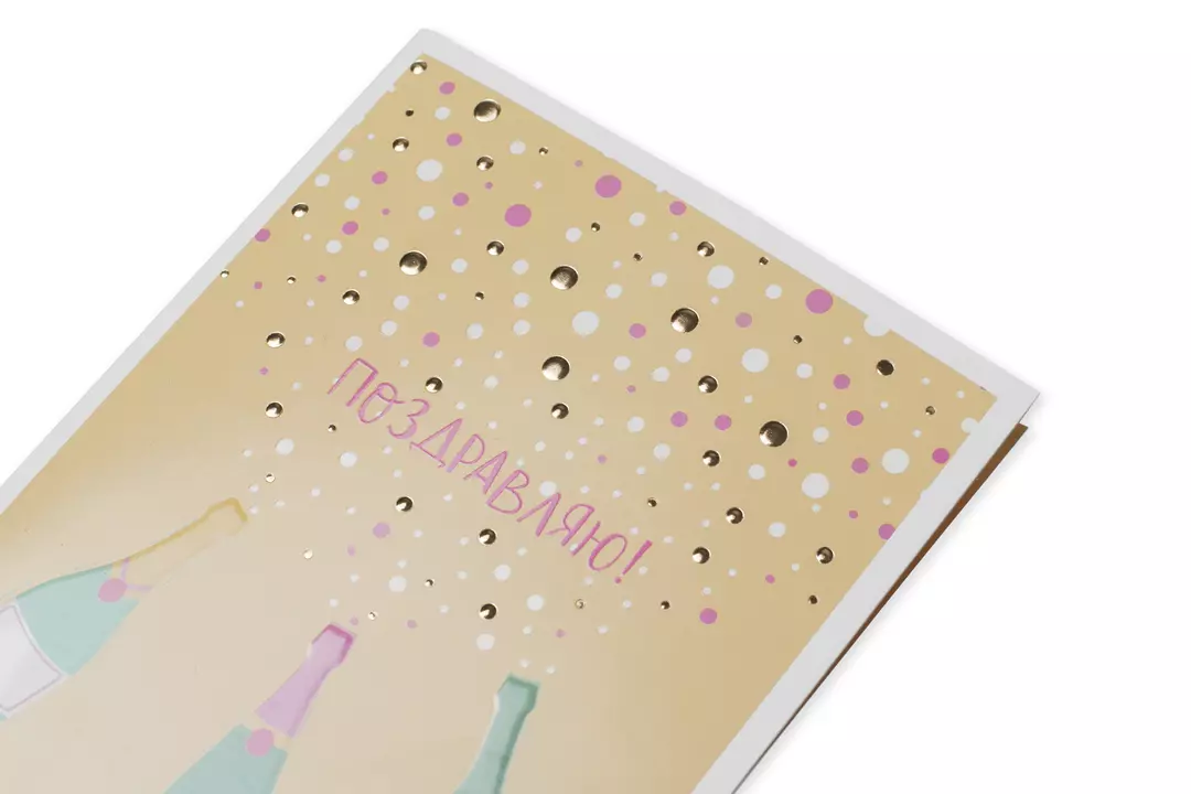 Открытка двойная Поздравляю с металлизированным тиснением, а также объемной фурнитурой в виде бутылок шампанского . Каждая открытка дополнена дизайнерским конвертом с паттерном и запакована в прозрачную упаковку для сохранности. Размер 11,4*16,9см. Страна производитель-Китай
