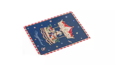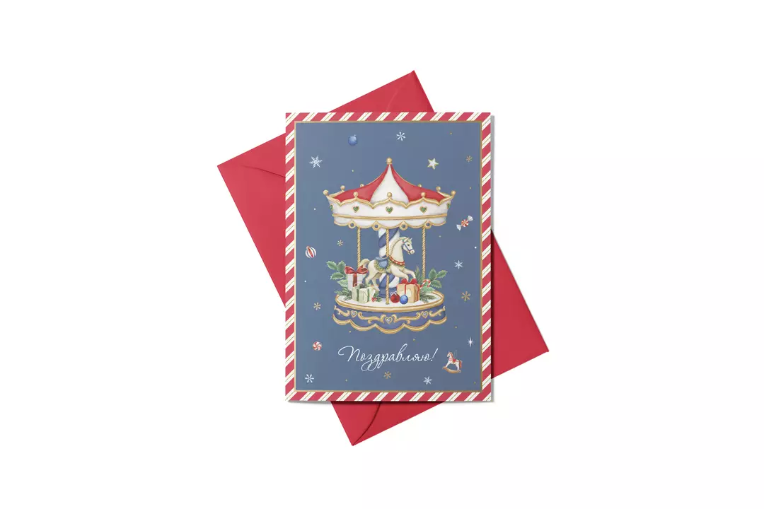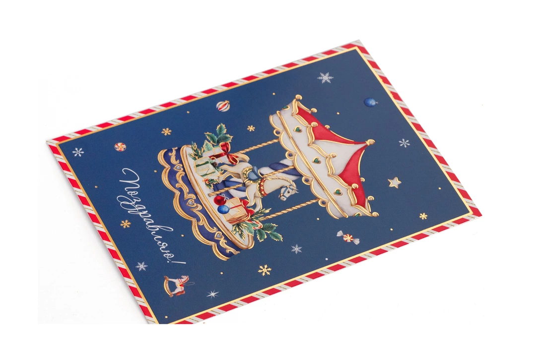 New Year Joy - одинарные новогодние открытки с золотым тиснением . Каждая упакована с конвертом в индивидуальный пакетик. Размер каждой открытки составляет 10,5*14,7 см. Открытка с изображением карусели с лошадкой , подарками. На обратной стороне открытки есть место для вашего текста и поздравлений. Страна производитель-Китай