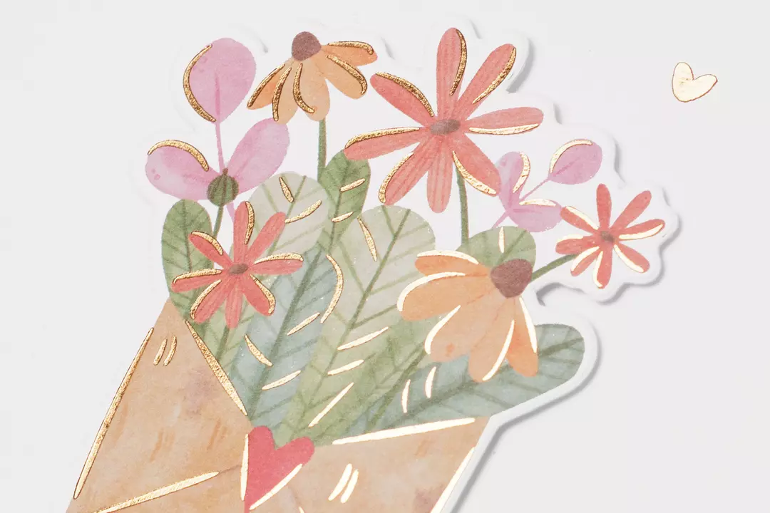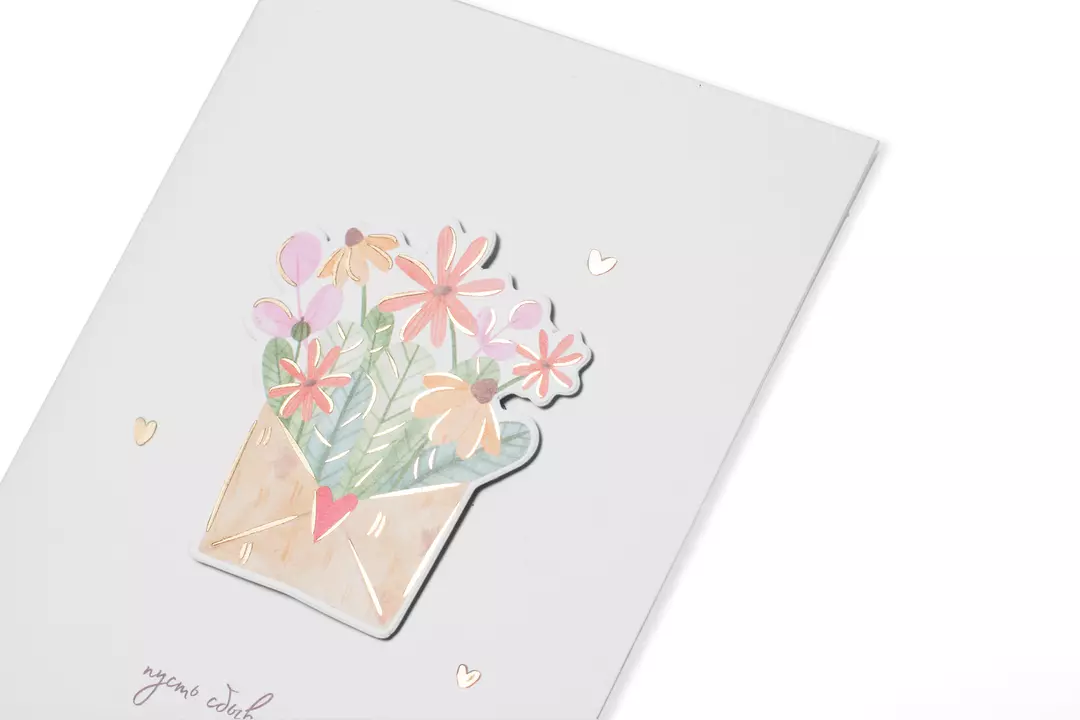 Открытка двойная Пусть сбываются мечты с металлизированным тиснением, а также объемной фурнитурой в виде конверта с цветами . Каждая открытка дополнена дизайнерским конвертом с паттерном и запакована в прозрачную упаковку для сохранности. Размер 11,4*16,9см. Страна производитель-Китай