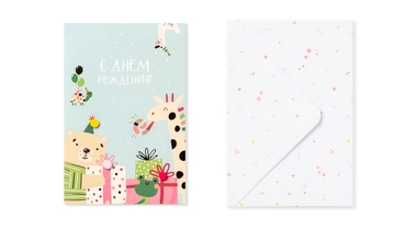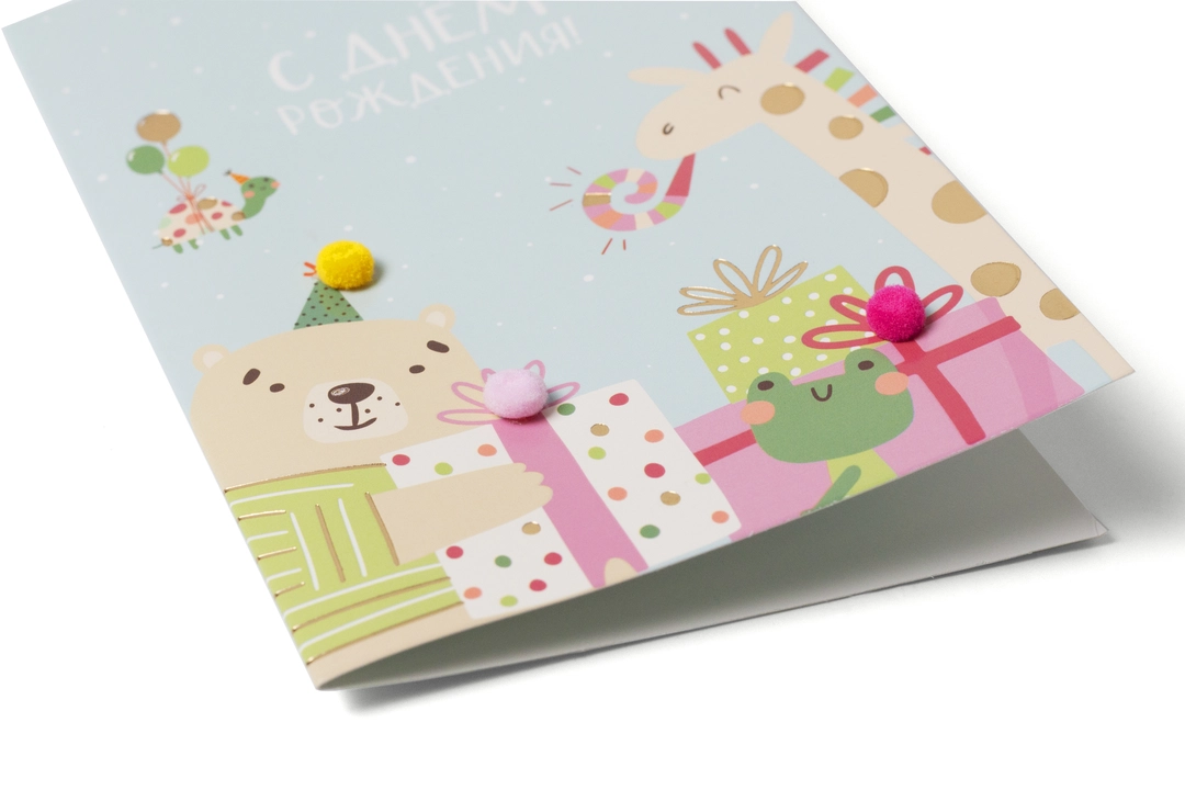 Открытка двойная С Днем Рождения с блёстками, металлизированным тиснением, а также объемной фурнитурой в виде помпонов. Каждая открытка дополнена дизайнерским конвертом с паттерном и запакована в прозрачную упаковку для сохранности. Размер 11,4*16,9см. Страна производитель-Китай