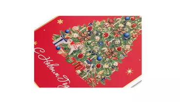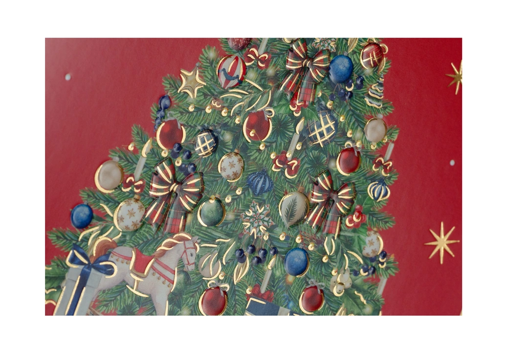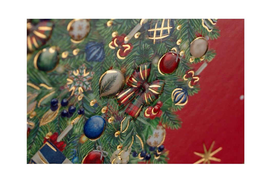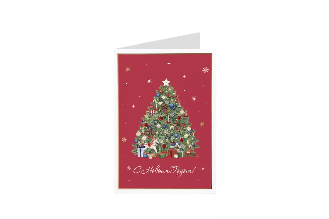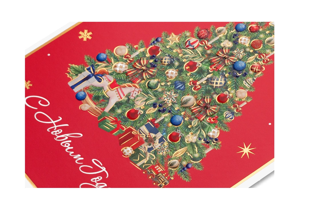 New Year Joy - двойные новогодние открытки с золотым тиснением и объемными элементами. Каждая упакована с конвертом в индивидуальный пакетик. Размер каждой открытки составляет 11,4*16,9 см. Открытка с изображением нарядной новогодней елки, с красивыми украшениями и подарками. Двойные открытки открываются и имеют добрые пожелания внутри, а также место для вашего текста и поздравлений. Страна производитель-Китай