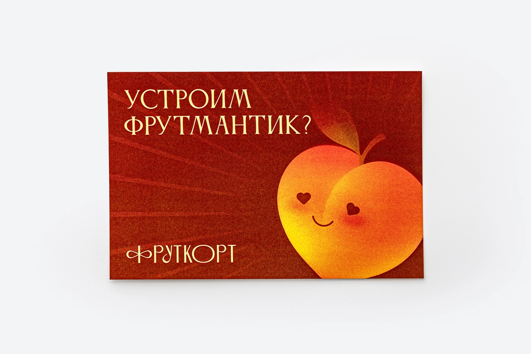 Игривый, лёгкий намёк на вечер вдвоём. Эта открытка создаёт настроение мягкой романтики и отлично дополняет фруктовый сет для свидания, делая приглашение приятно сладким. Характеристики: • Формат 150×100 мм • Бархатистая soft-touch бумага Фруткорт — это наша собственная кухня, где мы сами готовим свежие нарезки и напитки в течение дня. Больше информации и другие позиции можно найти в каталоге по слову «фруткорт».