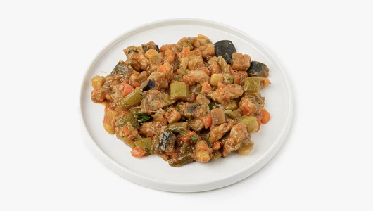 Сытное овощное рагу с мягким куриным филе и насыщенным овощным составом. Картофель даёт плотную основу, а стручковая фасоль, цукини и баклажаны добавляют блюду разнообразие текстур. Томаты связывают ингредиенты лёгкой кислинкой, подчёркивая вкус овощей и мяса, а чеснок и чёрный перец добавляют аккуратный пряный акцент. Блюдо получается сбалансированным и понятным — подойдёт для обеда или ужина, когда хочется чего-то тёплого, овощного и не перегруженного.