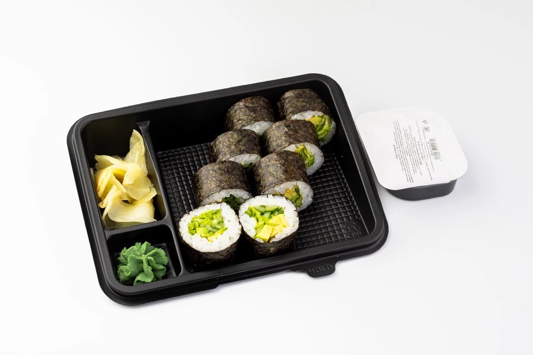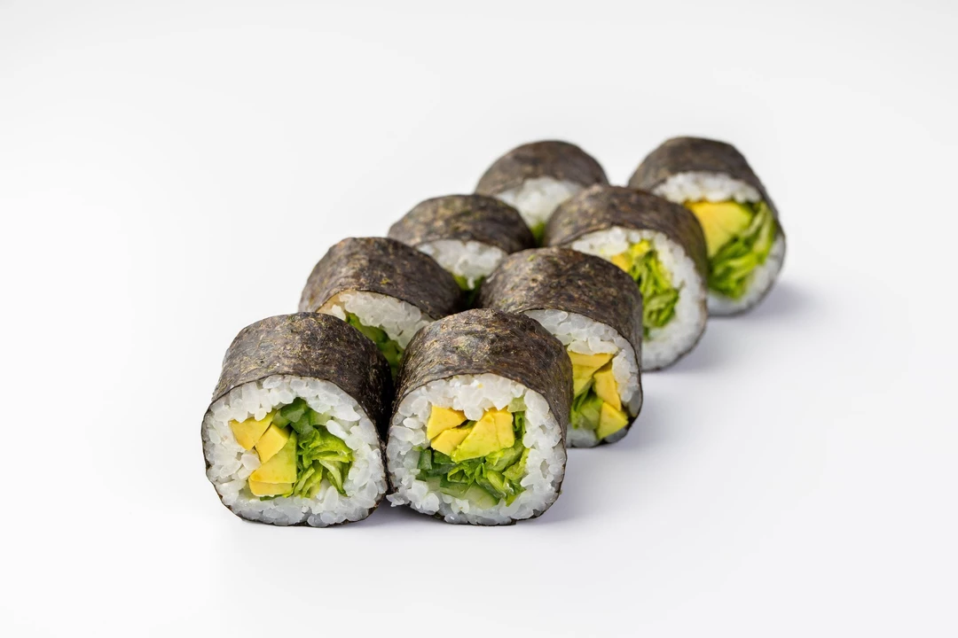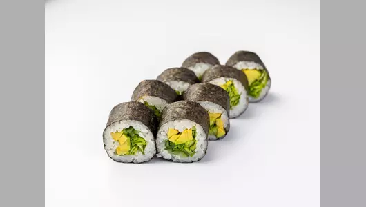 Чистая энергия и весенняя свежесть в каждом кусочке. В этом ролле мы собрали идеальный витаминный микс: кремовое авокадо, хрустящий огурец и сочные листья салата Айсберг. Тонкая игра текстур - от мягкости спелого авокадо до освежающего хруста овощей - подчеркивается благородным рисом, заправленным традиционным соусом на основе рисового уксуса. Обернутый в ароматный лист нори, этот ролл станет прекрасным выбором для тех, кто ценит легкость, натуральный вкус и пользу растительных ингредиентов. Комплектуется с соевым соусом, имбирем маринованный и васаби.