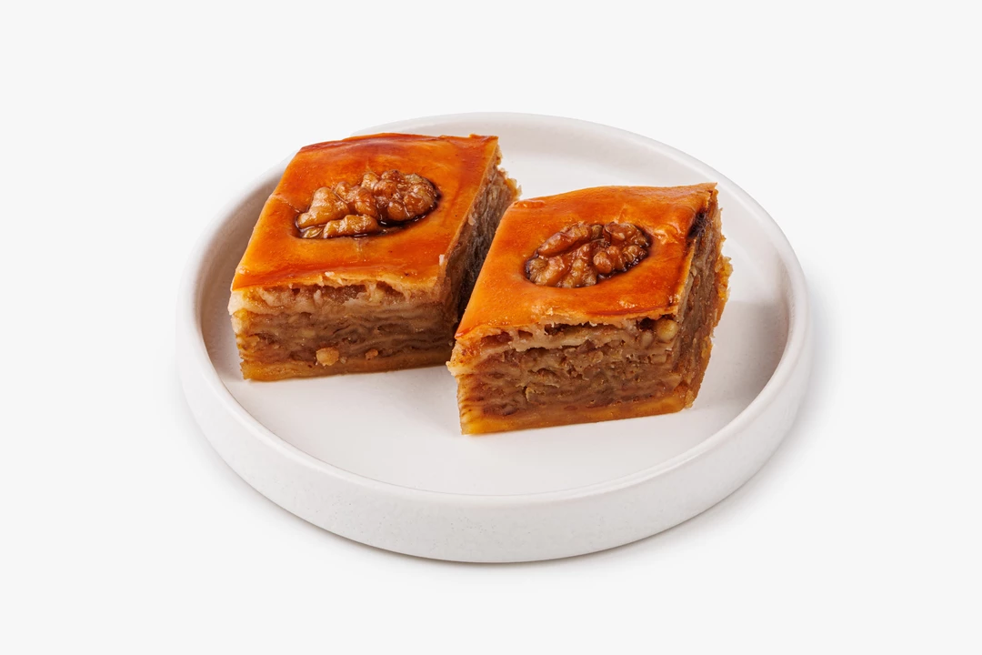 Пахлава приготовлена по традиционному рецепту из теста на сметане. Внутри ядра грецкого ореха, щепотка корицы и экстракт ванили для придания тёплого аромата.