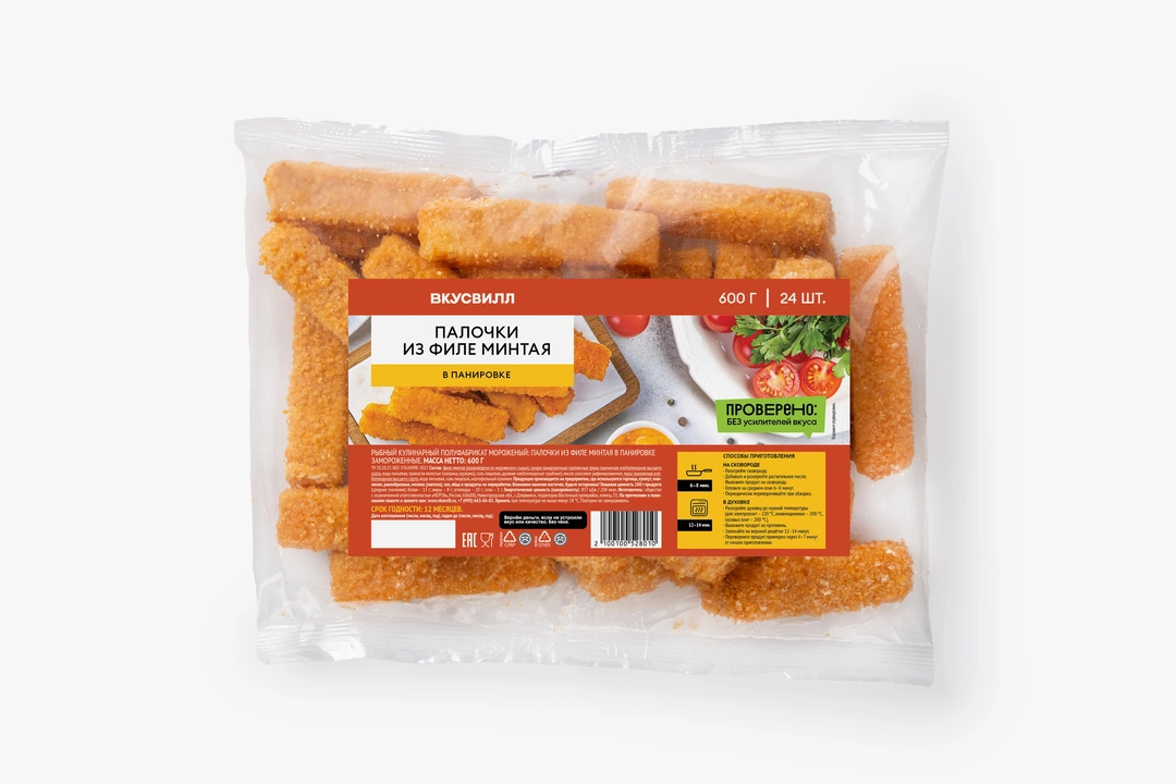 Аппетитные рыбные палочки — отличный вариант для обеда и ужина. Приготовить их не составит труда: обжарка займёт всего несколько минут. Благодаря панировочным сухарям, палочки приобретут хрустящую корочку, а филе минтая сохранит свою нежность и аромат. Чтобы вкус рыбы раскрылся ярче, советуем подавать с соусом тар-тар. Рыбные палочки изготовлены исключительно из филе минтая — без кожи и внутренностей.