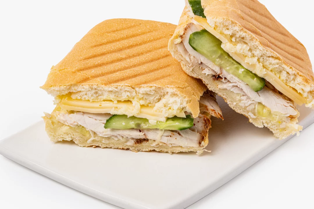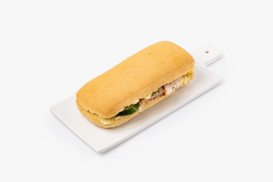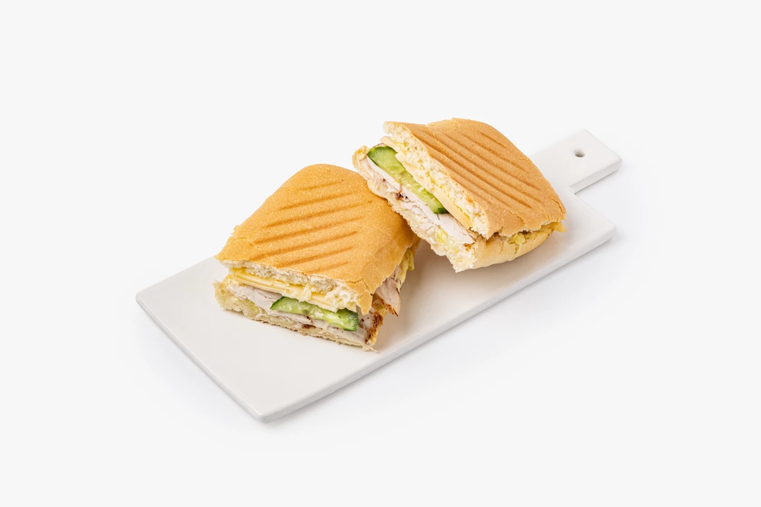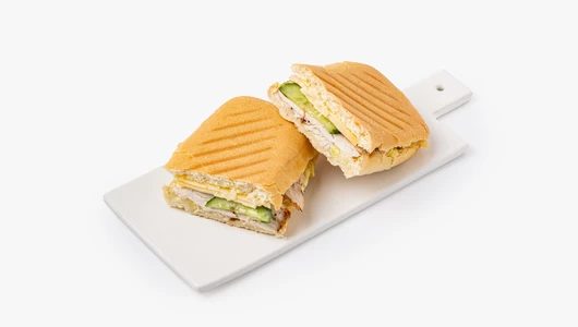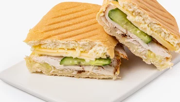Сытная панетта с нежным запечённым филе индейки — это сочетание свежей чиабатты, сочного мяса и пикантного горчичного соуса. Гауда добавляет сливочные нотки, а огурец и хрустящий айсберг освежают вкус. Удобный формат для перекуса на ходу или лёгкого обеда.