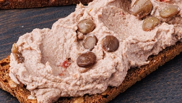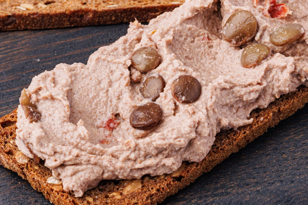 Постный паштет из зелёной чечевицы, дополненный грецкими орехами, сушёными томатами и пассерованным луком. С лёгкой текстурой и нежным, но самодостаточным вкусом, в котором чувствуется каждый перечисленный ингредиент. Закуска идеально подойдёт для сытных бутербродов — с багетом, тостами и хлебцами. К тому же паштетом можно начинить рулетики из баклажанов.